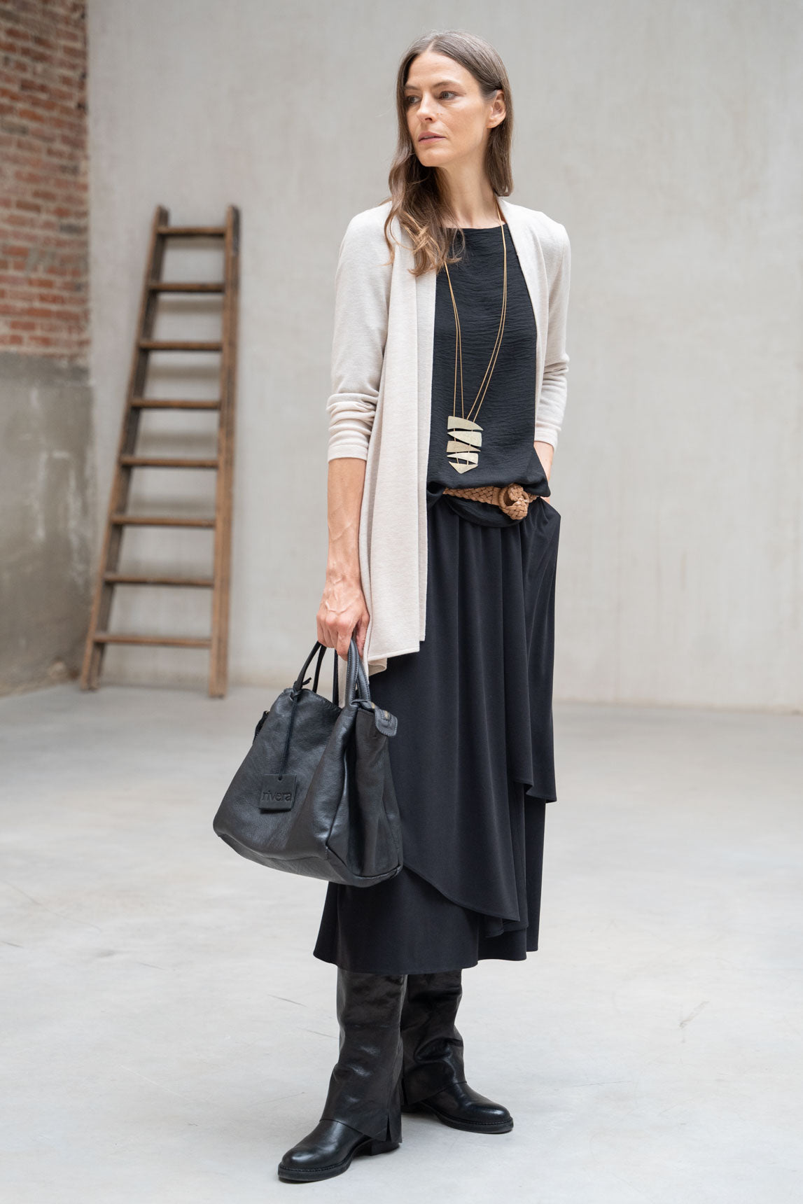 El cárdigan Orsara crudo es una prenda versátil y atemporal que eleva cualquier look. Su diseño abierto y su tejido ligero lo hacen ideal para llevar sobre vestidos, blusas o camisetas, tanto en estilismos de oficina como en outfits informales.