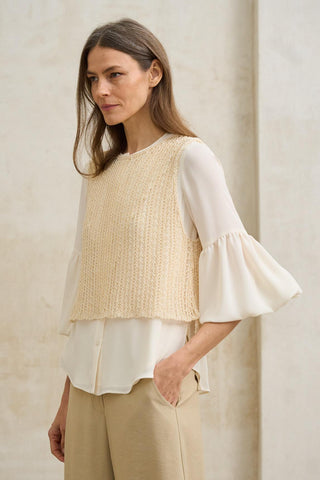 La blusa Mireya crudo roto es una prenda ligera y delicada, confeccionada en tejido semitransparente que aporta movimiento y sutileza al diseño. Su silueta fluida y su caída suave crean un efecto elegante y femenino, ideal para estilismos luminosos y sofisticados. Presenta escote redondeado y manga larga ligeramente abullonada con puño elástico, que equilibra volumen y ligereza. El acabado translúcido del tejido añade profundidad visual y permite jugar con superposiciones, recomendando combinarla con una camiseta o top interior para mayor cobertura. El tono blanco roto refuerza su versatilidad y la convierte en una pieza esencial dentro de un armario neutro. Perfecta para combinar con pantalones fluidos, faldas midi o denim claro, tanto en looks de diario como en estilismos más cuidados. Nos esforzamos por mostrar los colores de la forma más fiel posible, pero pueden variar ligeramente respecto a la realidad.