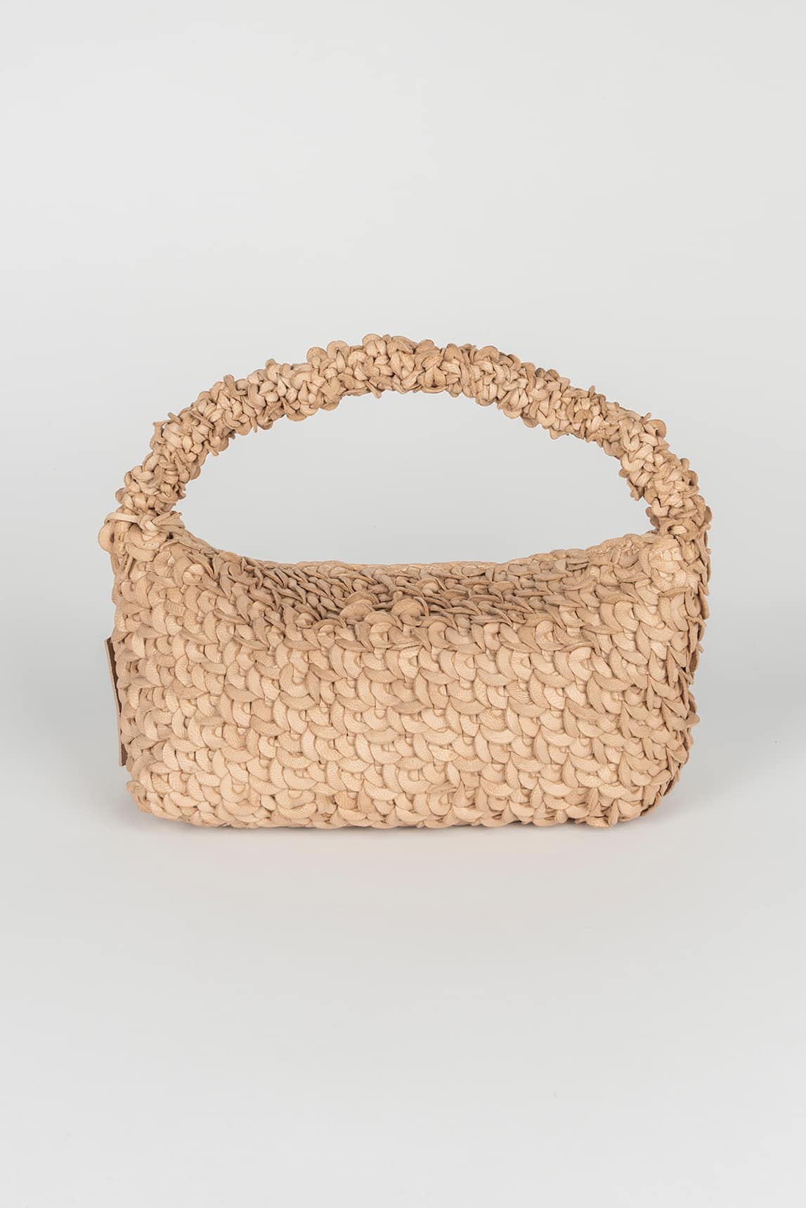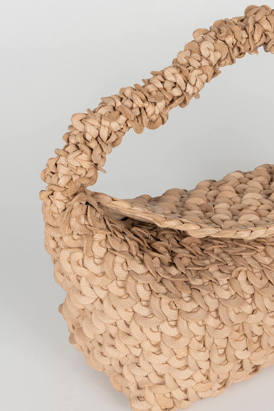 Bolso de piel trenzada en tono beige claro, elegante y luminoso, ideal para estilismos suaves y combinaciones naturales.