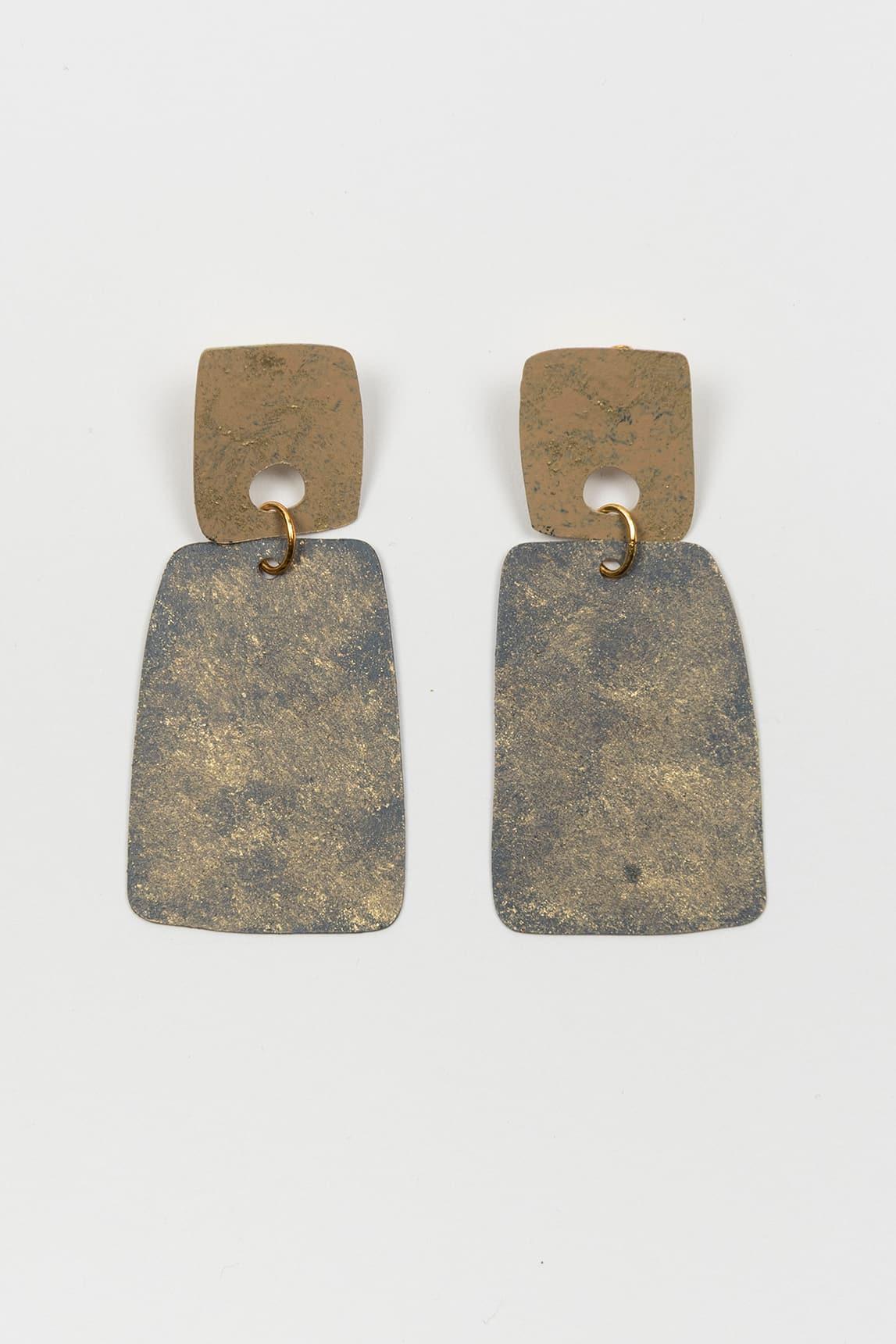 *NO SE ADMITE CAMBIO NI DEVOLUCIÓN DE ESTE PRODUCTO. Pendientes de formato medio con diseño geométrico y composición de dos piezas superpuestas de contorno rectangular suavizado. Presentan un acabado metálico en tono dorado con superficie texturada y matices irregulares que aportan profundidad visual y un brillo sutil. La pieza superior, más compacta, da paso a un cuerpo inferior de mayor tamaño que crea una caída limpia y equilibrada, enmarcando el rostro con una presencia serena y contemporánea.