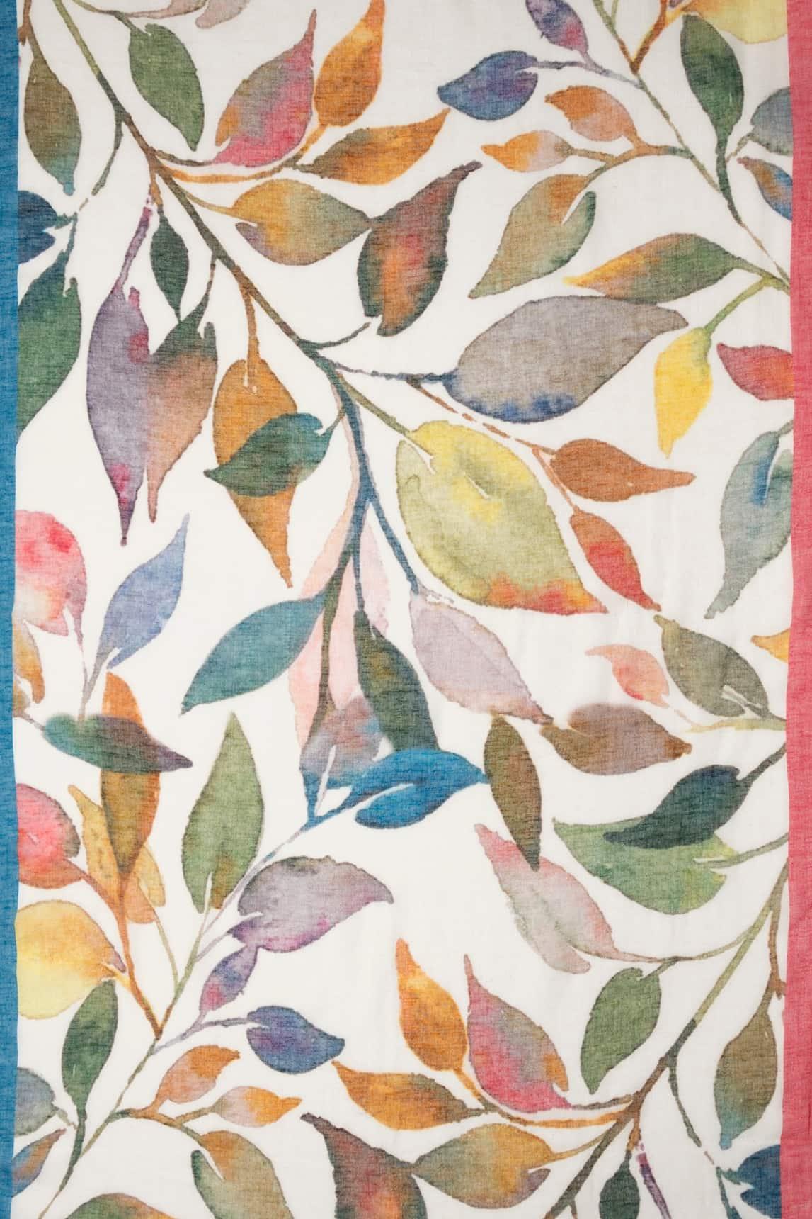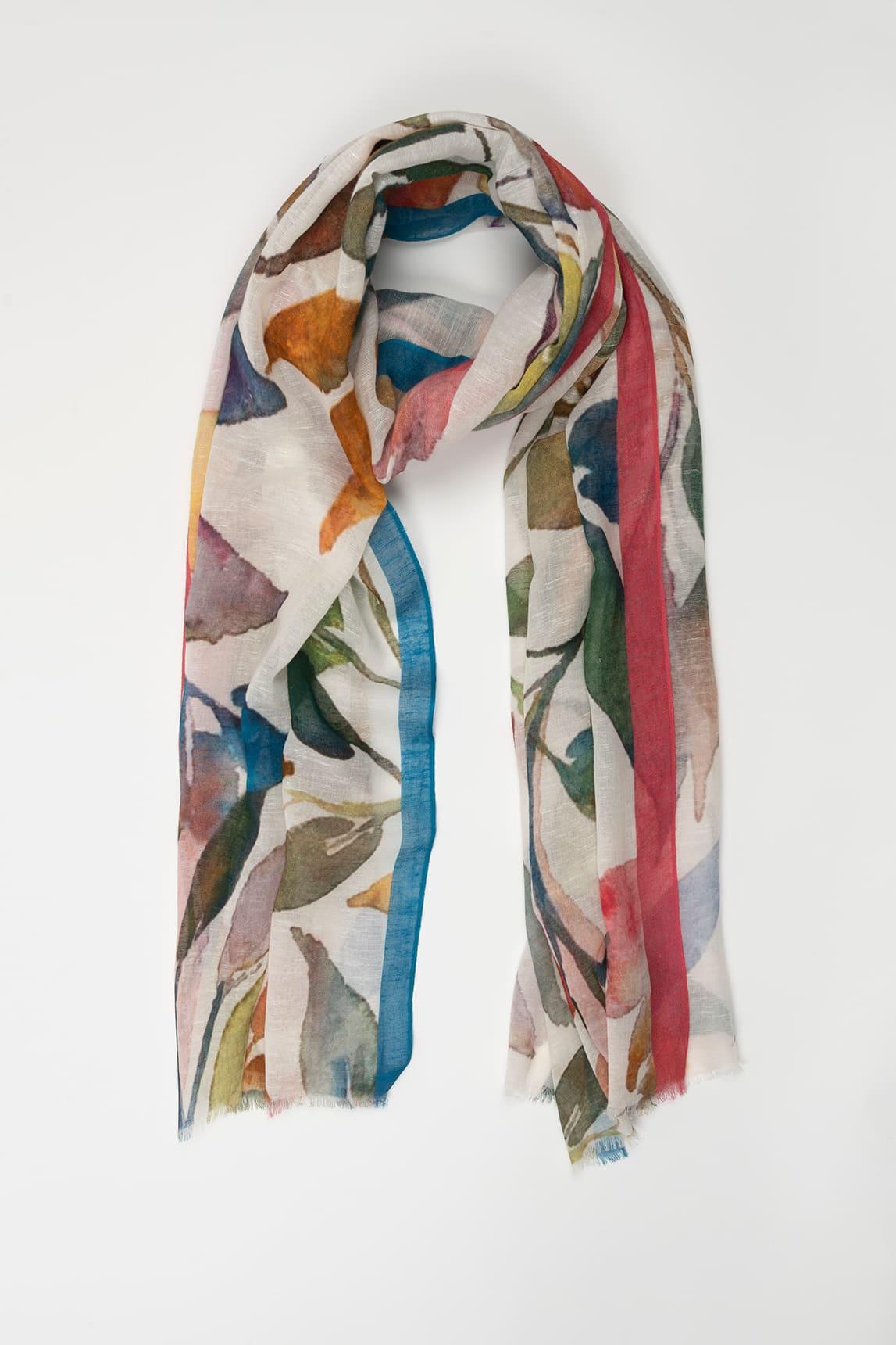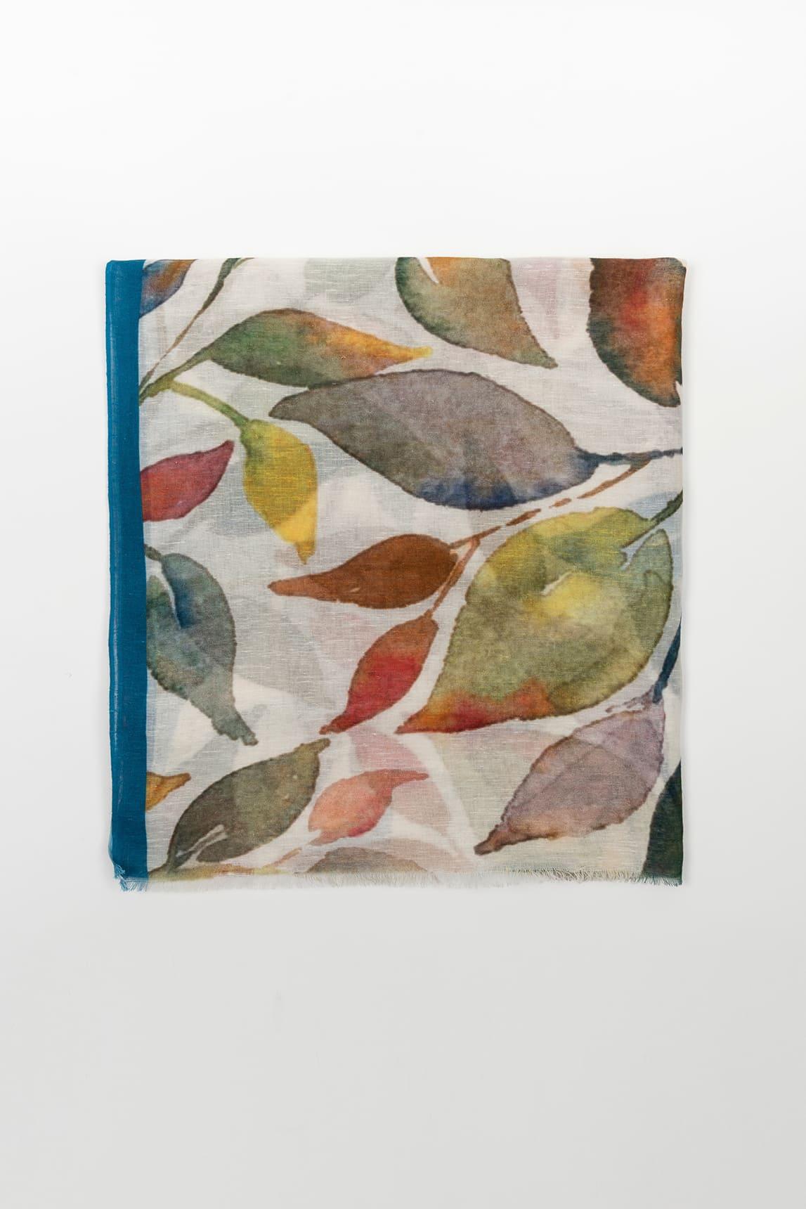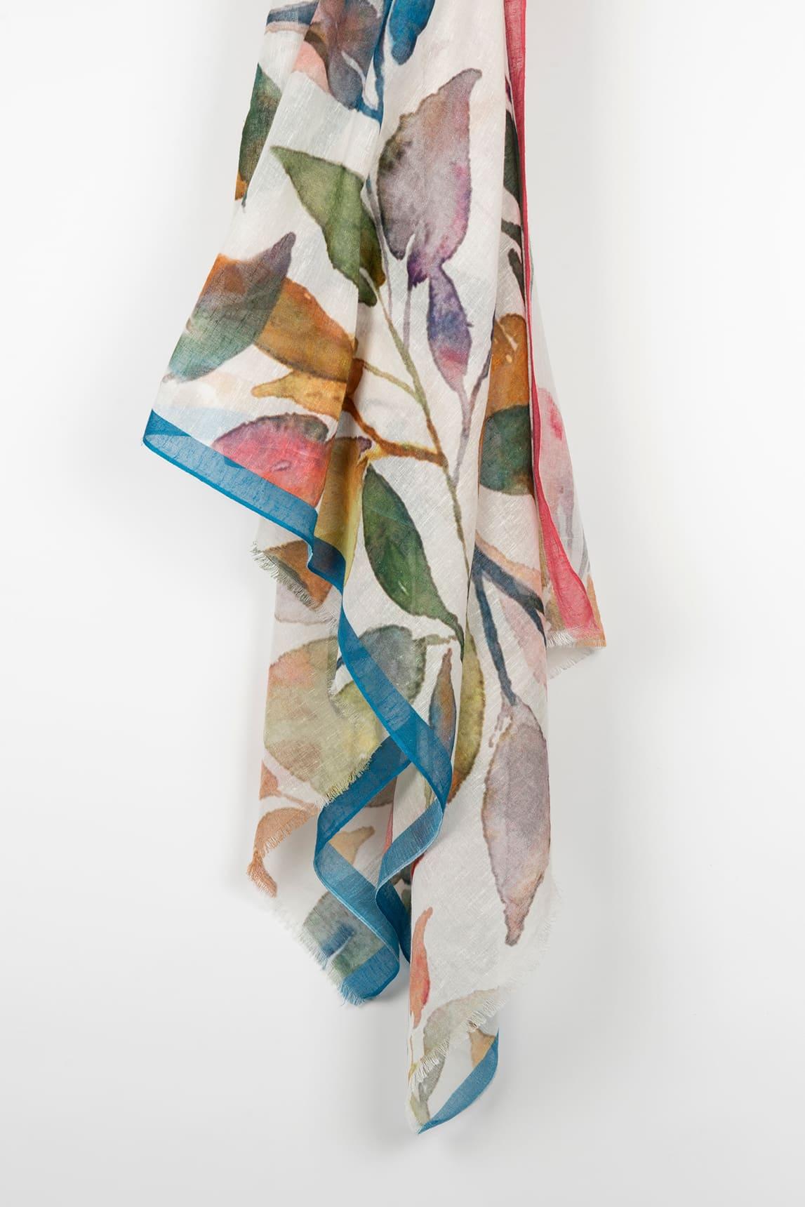 El fular Althea Floral destaca por su estampado de inspiración floral en tonos suaves y luminosos. Hojas y pétalos en verde, coral, mostaza y azul se superponen sobre una base clara, creando un diseño dinámico y delicado al mismo tiempo.