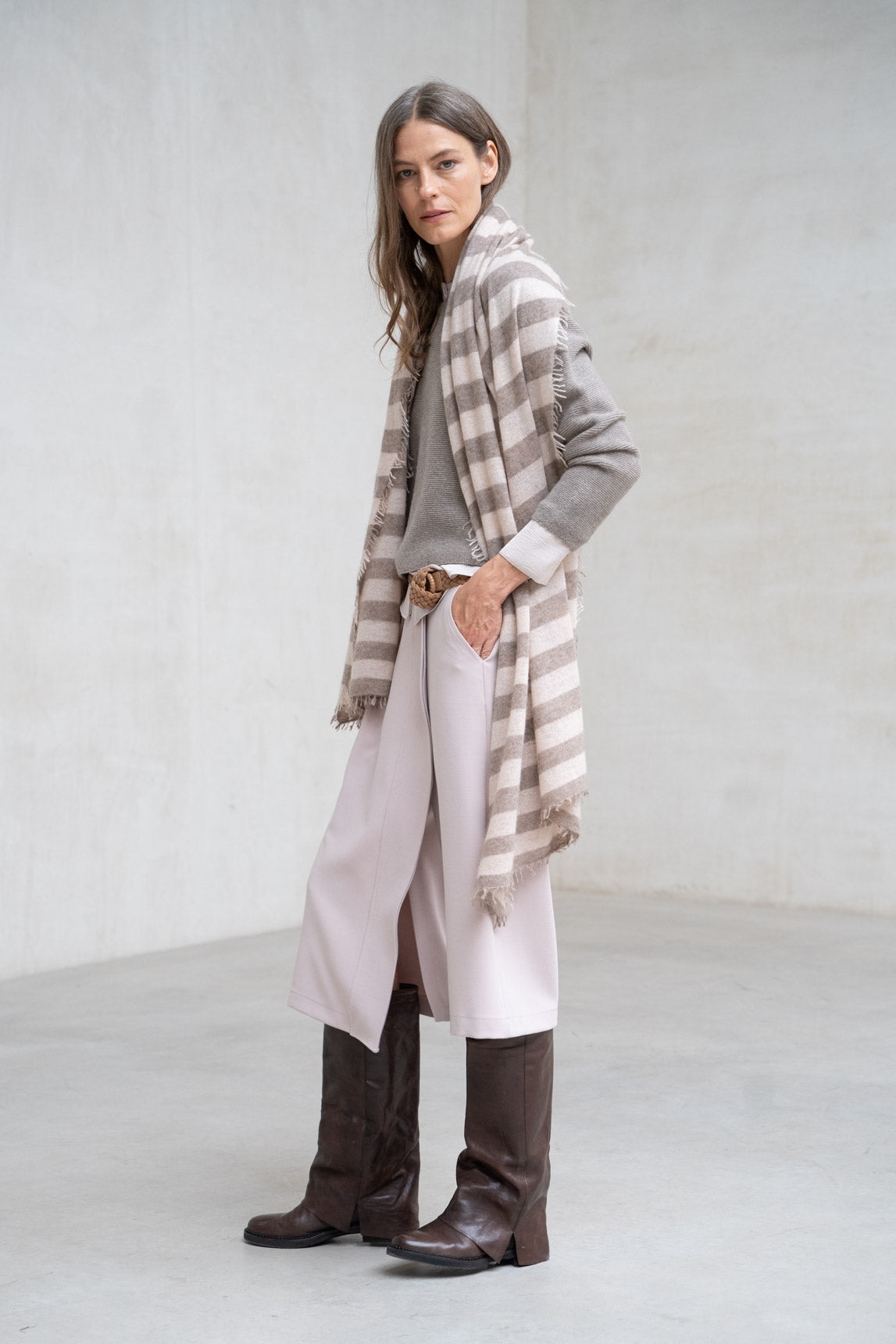 Descubre el fular rayas beige de Rivera, de inspiración invernal con diseño de rayas anchas en beige y topo. Confeccionado en cachemir ofrece una textura envolvente perfecta para aportar abrigo sin perder ligereza. Su patrón a rayas diagonales aporta dinamismo y combina fácilmente con prendas lisas o en la gama de los tonos tierra. Los bordes con flecos aportan un acabado relajado que refuerza su carácter casual y natural. Una opción versátil y funcional para el día a día, ideal como complemento en looks urbanos, neutros o de aire bohemio.