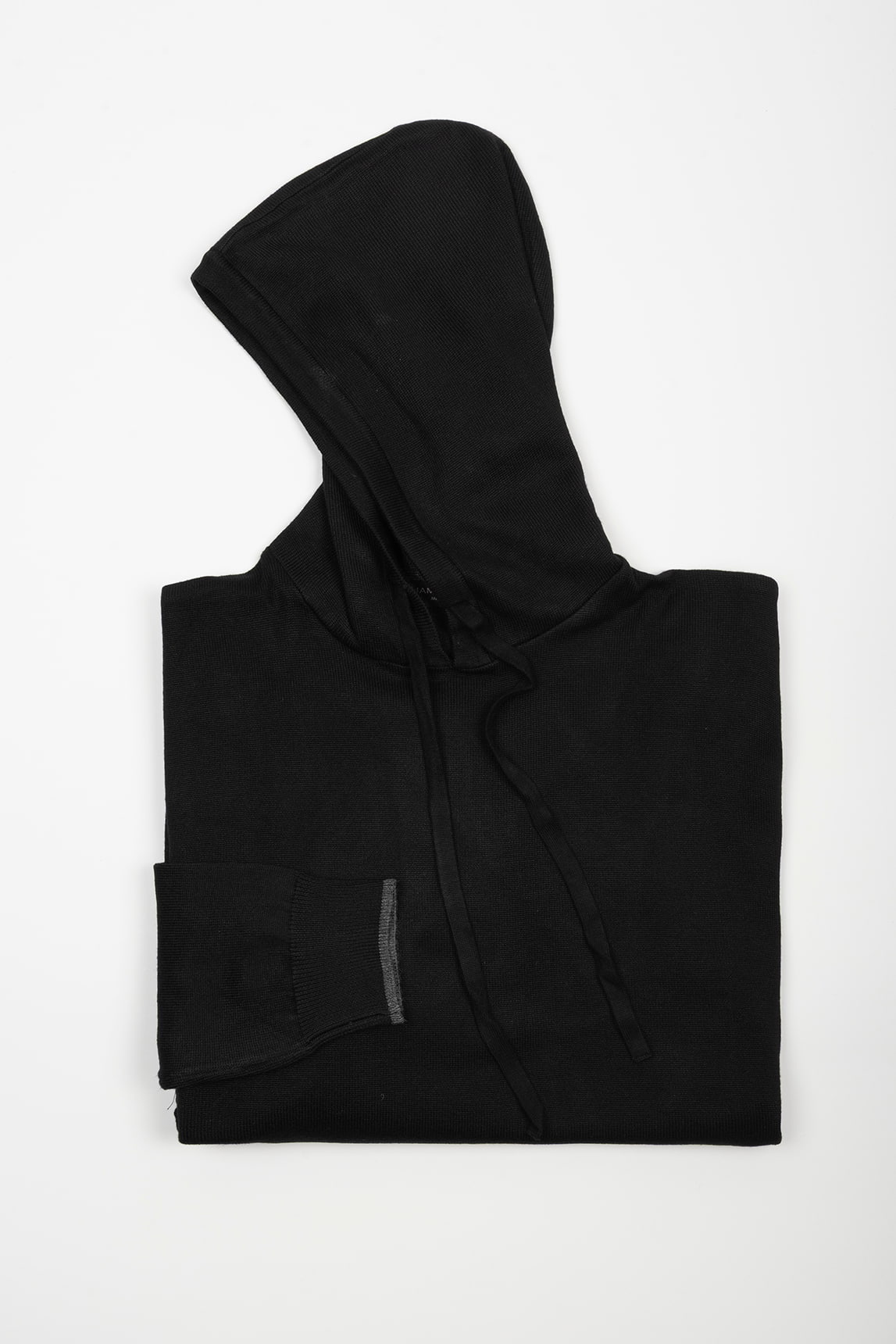 Este jersey con capucha de Hamaki-Ho apuesta por la sencillez sofisticada: negro profundo, punto agradable y un fit cómodo que funciona tanto con vaqueros y zapatillas como bajo una cazadora para un look urbano pulido.