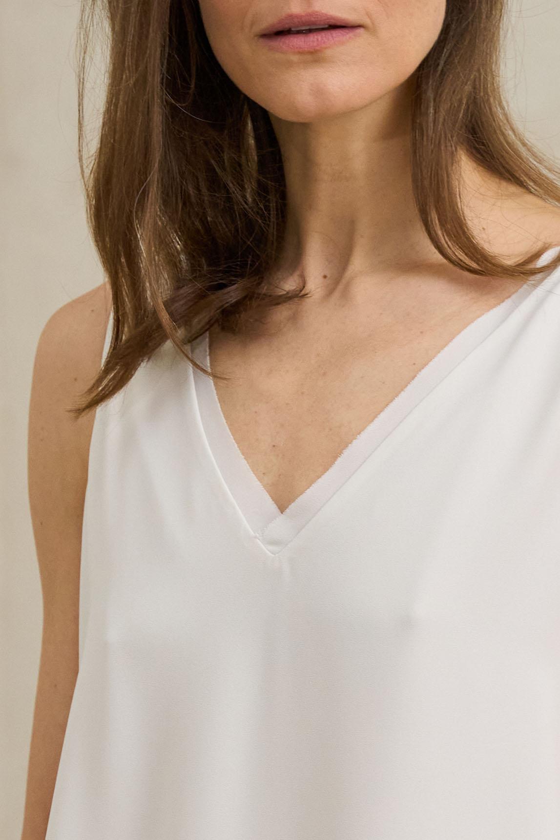 Este top sin mangas presenta una silueta ligera y amplia, definida por un escote en pico delantero y trasero que estiliza la parte superior. El tejido muestra una caída suave y continua, con un acabado liso que potencia la sensación de fluidez. El bajo ligeramente redondeado aporta movimiento y refuerza su estética relajada, mientras que el corte suelto permite que la prenda acompañe el cuerpo sin ajustarse.