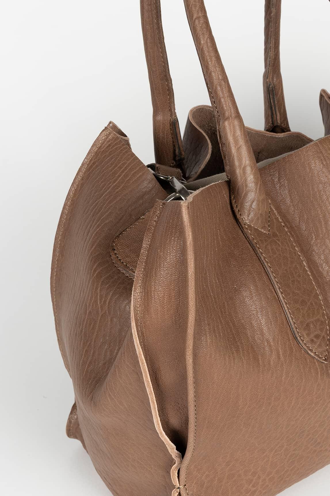 Bolso confeccionado en piel en tono marrón, una tonalidad sofisticada entre beige y marrón que aporta profundidad sin resultar oscuro.