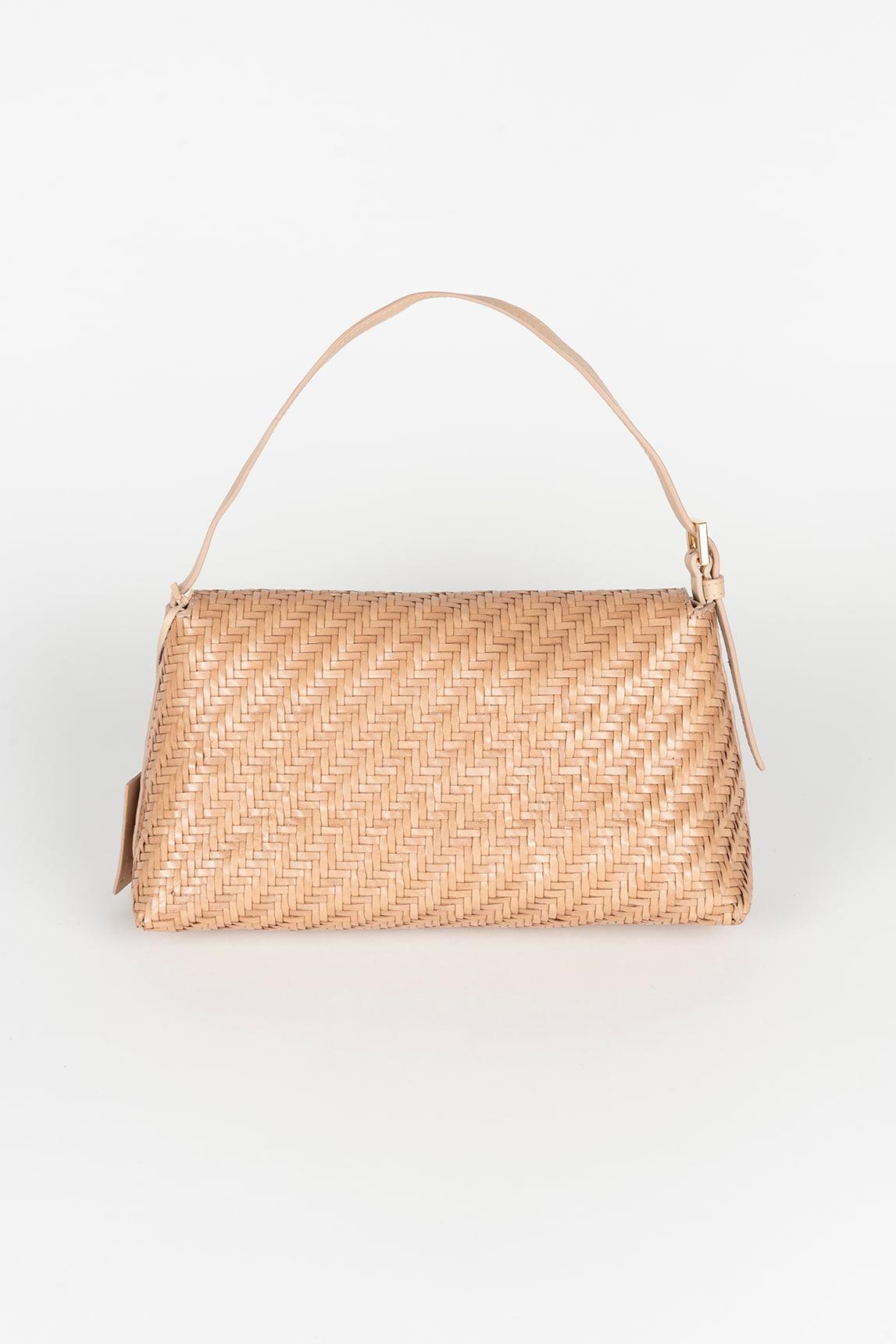 Este bolso compacto presenta una silueta rectangular definida con solapa frontal que estructura el diseño y aporta equilibrio visual. La superficie está completamente trabajada en trenzado fino en patrón espiga, creando una textura uniforme y elegante que añade profundidad. Incorpora asa corta ajustable con herraje metálico en tono dorado, manteniendo una estética limpia y funcional. Su formato ligero lo convierte en una opción práctica para llevar lo esencial con comodidad.