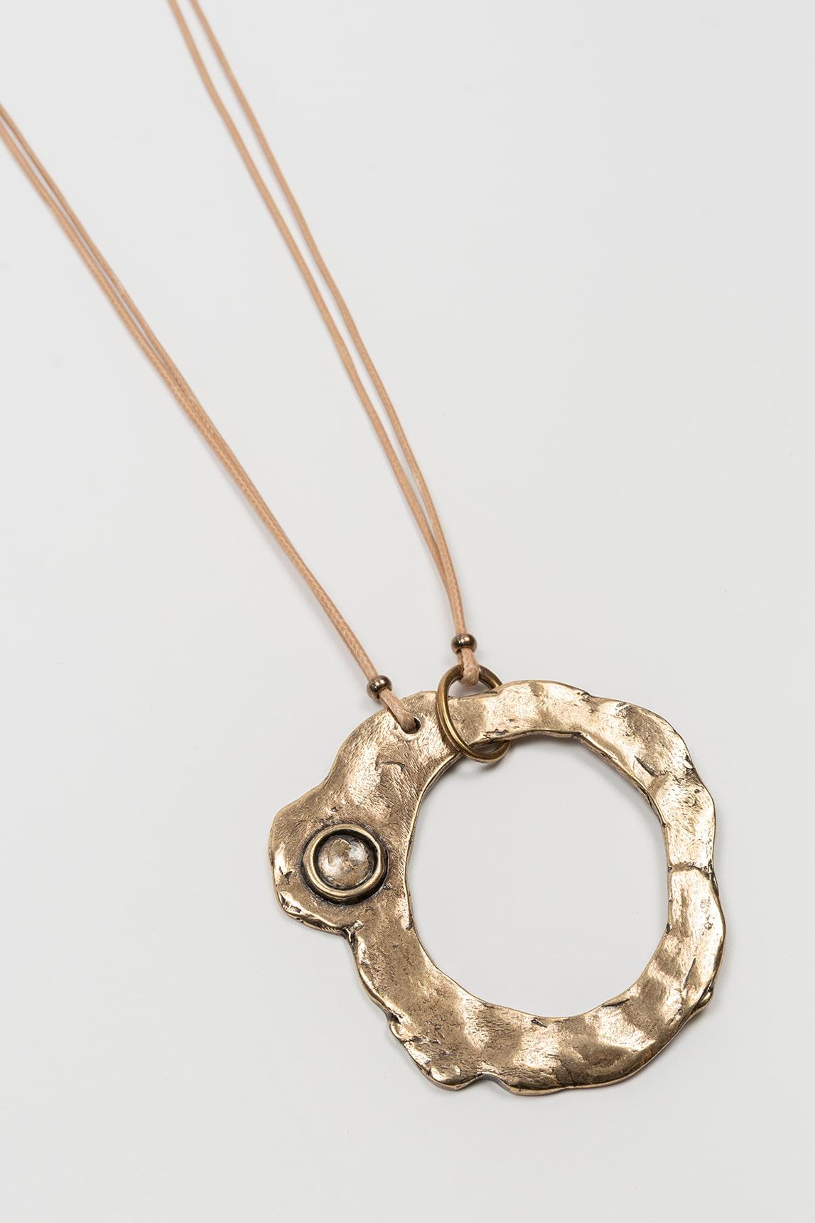 El collar Orvella en latón mantiene la silueta alargada y el colgante circular de textura irregular que define el modelo. Su diseño combina simplicidad estructural con un detalle central de fuerte presencia visual.