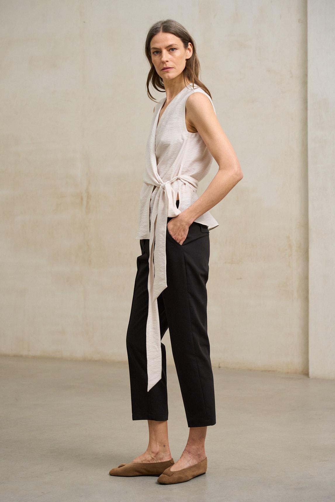La Camisa Zarev crudo destaca por su diseño cruzado con lazada lateral que define la silueta de forma natural y favorecedora. Confeccionada en tejido ligero de caída fluida, presenta escote en pico y diseño sin mangas que estiliza visualmente el torso.