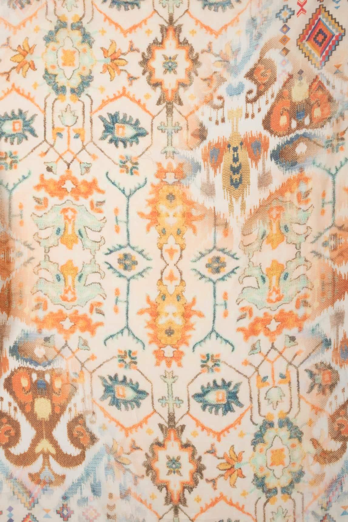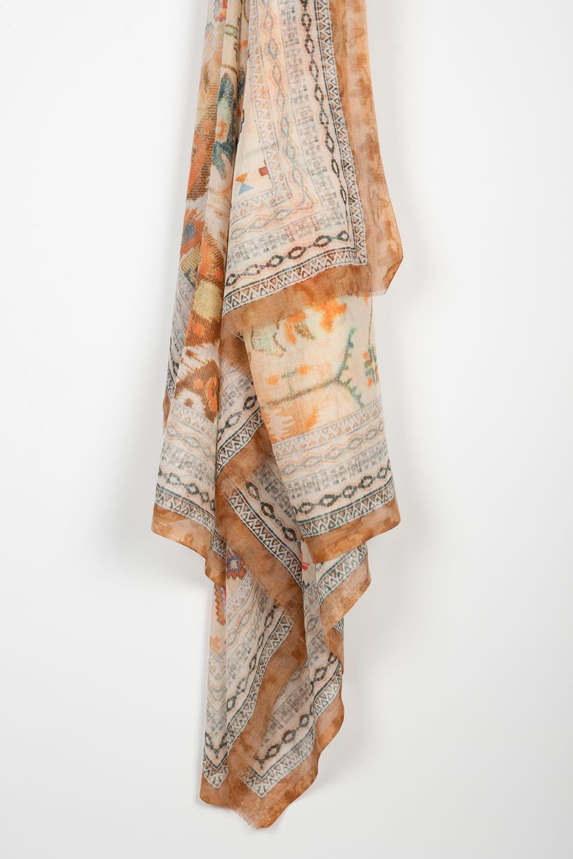 Fular de mujer confeccionado en una mezcla suave de 45 % algodón y 55 % modal. Su tejido ligero y delicado ofrece una textura sedosa con excelente caída y transpirabilidad. Presenta un estampado ornamental en tonos tierra, beige y toques anaranjados, enmarcado por un borde decorativo que refuerza su carácter artesanal y elegante. El Fular Éclat terracota destaca por su versatilidad y su equilibrio entre color y ligereza. Ideal para aportar un acento cálido a looks neutros o naturales, puede lucirse sobre los hombros, al cuello o como complemento de bolso. Una pieza refinada que combina confort, estilo y distinción. Nos esforzamos por mostrar los colores de la forma más fiel posible, pero pueden variar ligeramente respecto a la realidad.
