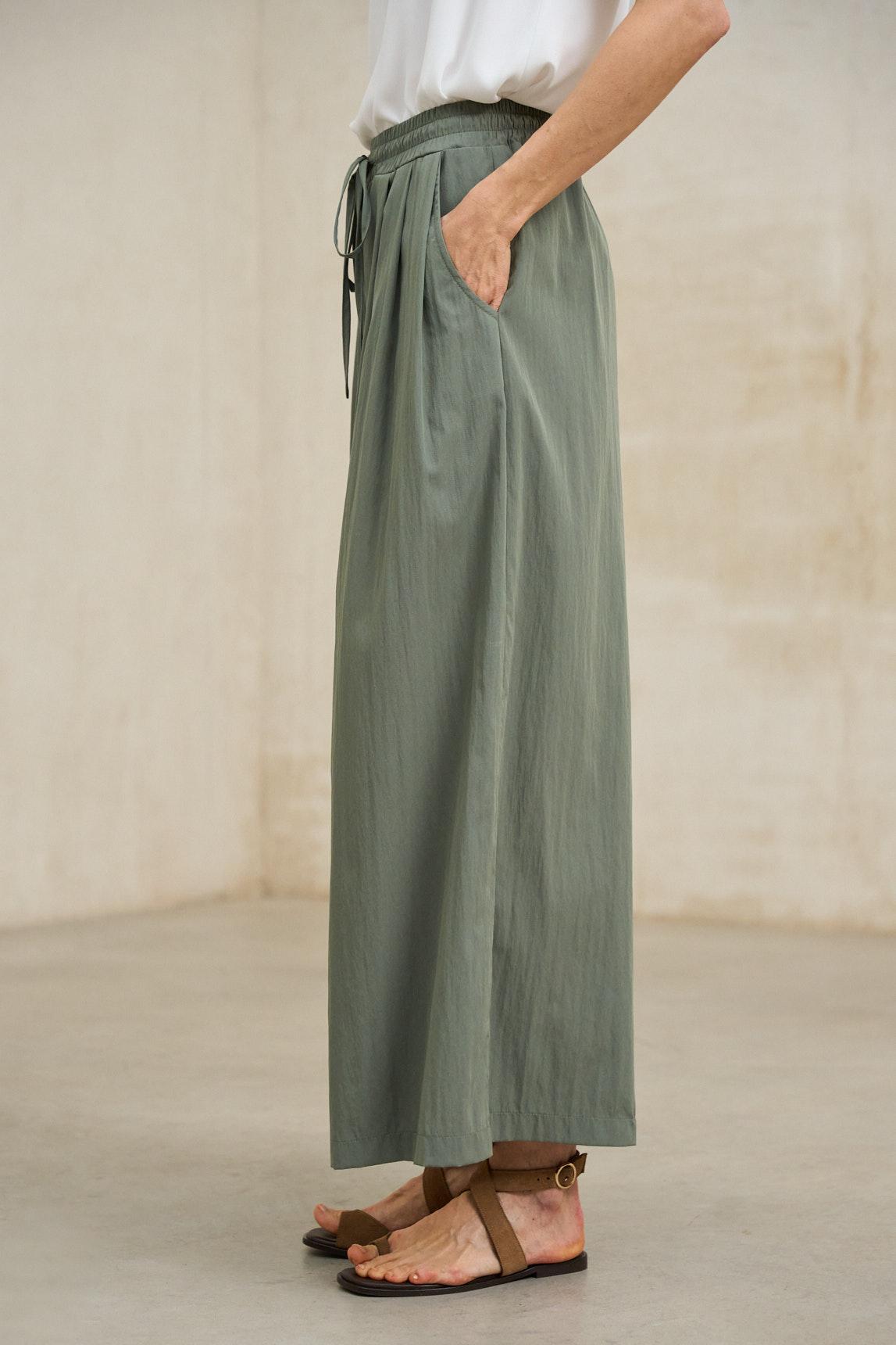 Pantalón de mujer confeccionado en tejido ligero y fluido con caída natural. Cintura elástica con fruncido y cordón ajustable que aporta confort y adaptabilidad. Presenta bolsillos laterales discretos y pernera ancha con pliegues verticales que estilizan la figura y favorecen el movimiento.