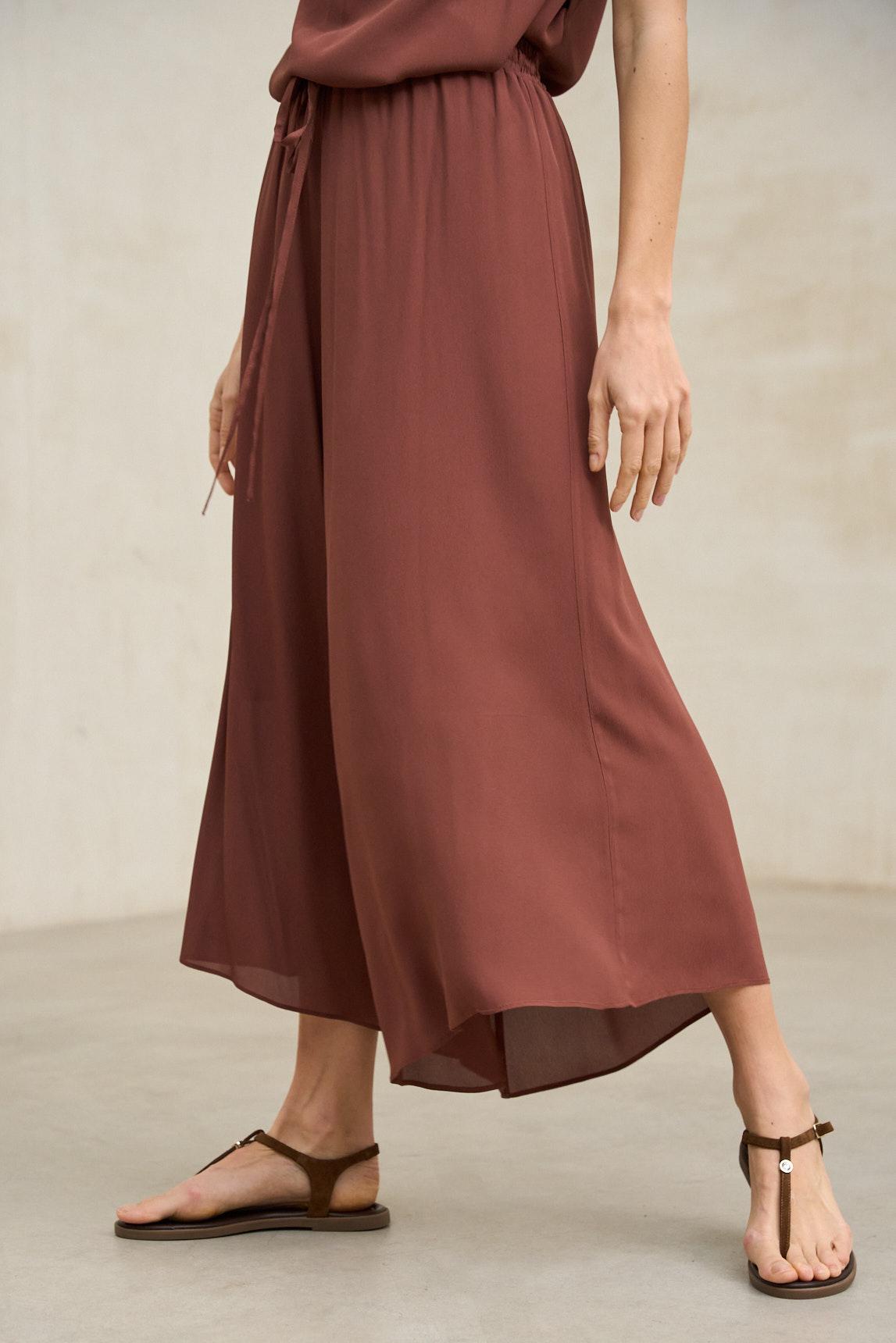 Falda larga confeccionada en tejido fluido con caída ligera y movimiento natural. Presenta cintura limpia con ajuste cómodo y una silueta evasé que se abre suavemente desde la cadera, creando un efecto elegante y favorecedor. El diseño destaca por su vuelo sutil y su acabado ligero, que aporta dinamismo al caminar. La Falda Nareia en color terracota aporta calidez y sofisticación al look. Su tono tierra profundo resulta ideal para combinar con blancos rotos, crudos y tonos arena, pero alcanza su máxima expresión cuando se lleva junto a la Blusa Támara, creando un conjunto coordinado equilibrado y armónico. La fluidez del tejido suaviza la intensidad del color, logrando una prenda femenina, versátil y atemporal. Perfecta para primavera y verano, puede llevarse con sandalias planas para un estilismo natural o con calzado más estructurado para un resultado más refinado. Una falda pensada para aportar movimiento, comodidad y presencia sin esfuerzo. Nos esforzamos por mostrar los colores de la forma más fiel posible, pero pueden variar ligeramente respecto a la realidad.