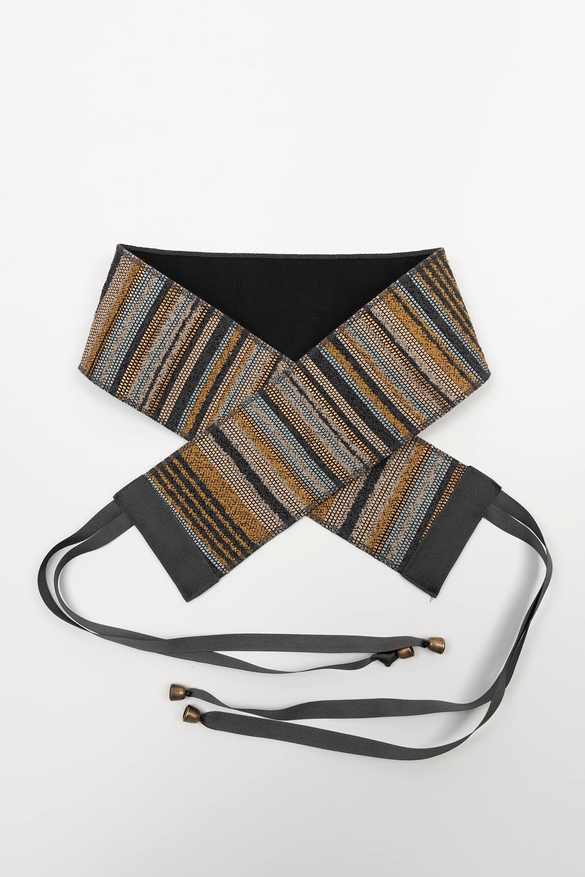 - Fajín ancho con diseño de rayas étnicas.