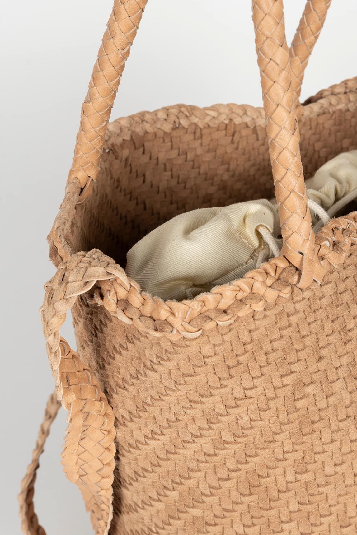 El bolso Serelis en color arena es una pieza de piel trenzada que fusiona artesanía y diseño contemporáneo. Su forma cilíndrica tipo cubo aporta estructura y equilibrio visual, mientras que el trenzado fino resalta la textura natural del material y le da un carácter distintivo.