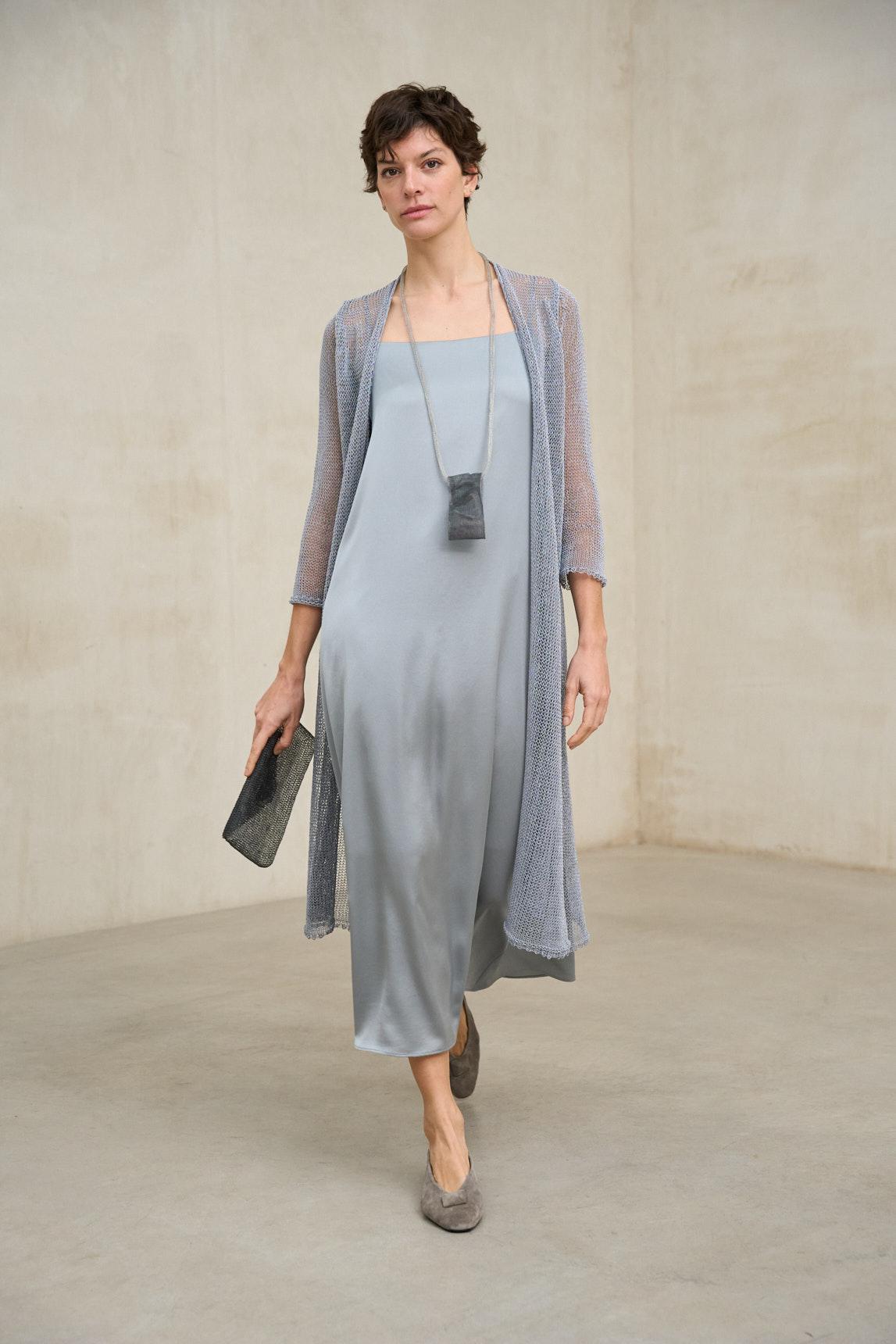El vestido Soreya azul humo es una pieza de líneas depuradas y estética minimalista, confeccionada en tejido ligero con caída fluida. Su diseño de tirantes finos y escote recto suavemente curvado realza hombros y clavícula con una elegancia sutil y contemporánea.