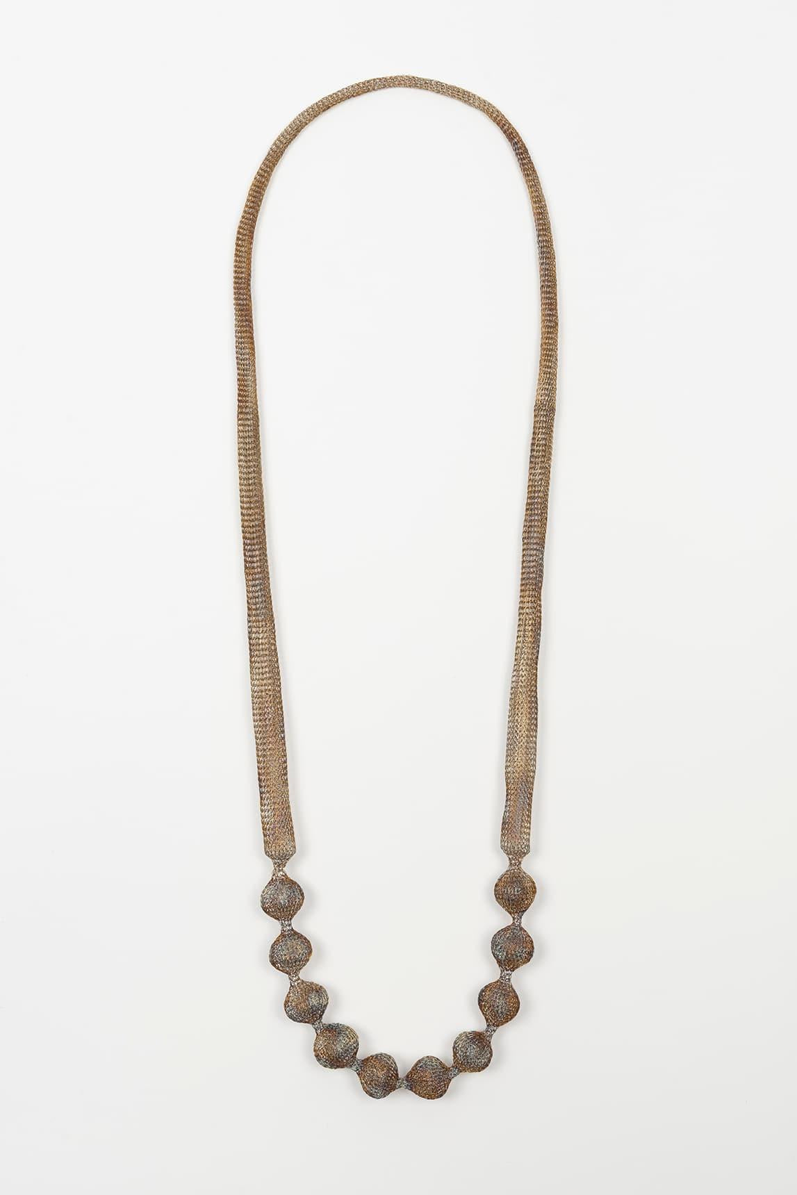 El acabado en latón aporta un tono dorado cálido y elegante que realza la textura sutil de cada elemento. La disposición progresiva de las piezas genera un punto focal delicado pero con personalidad, ideal para acompañar prendas lisas o escotes abiertos.