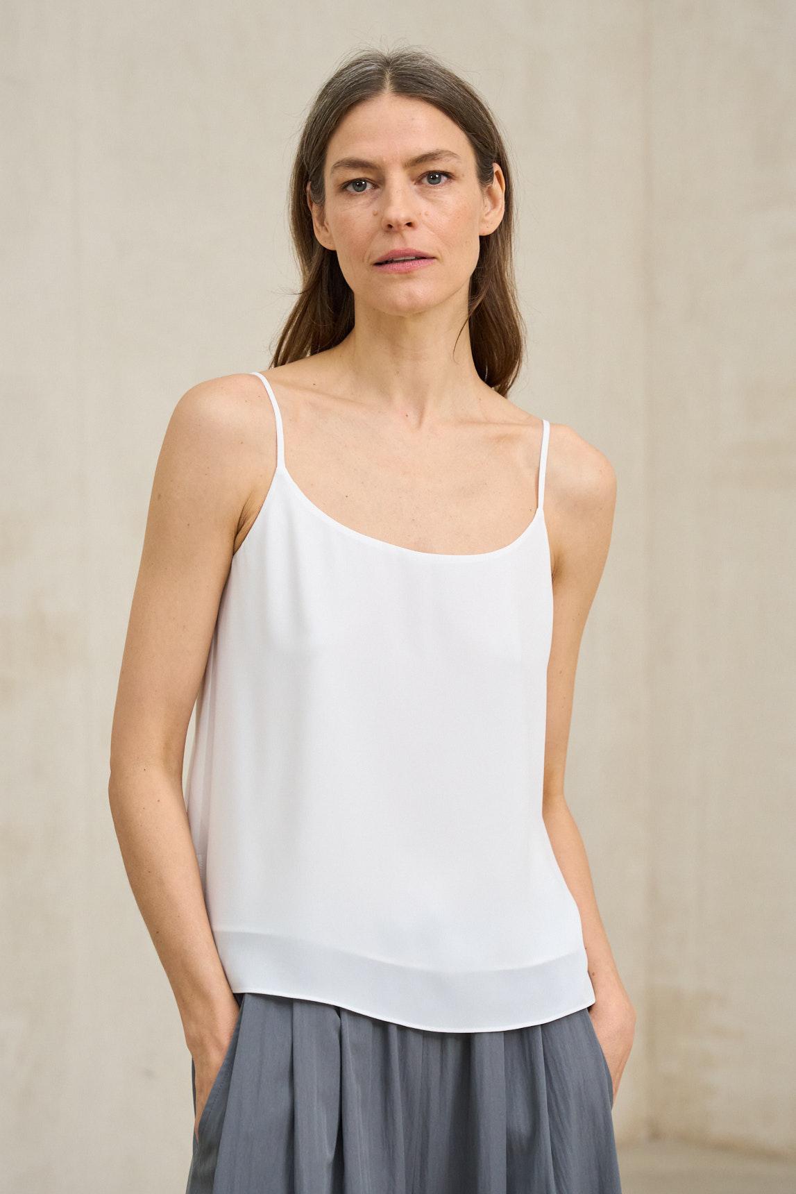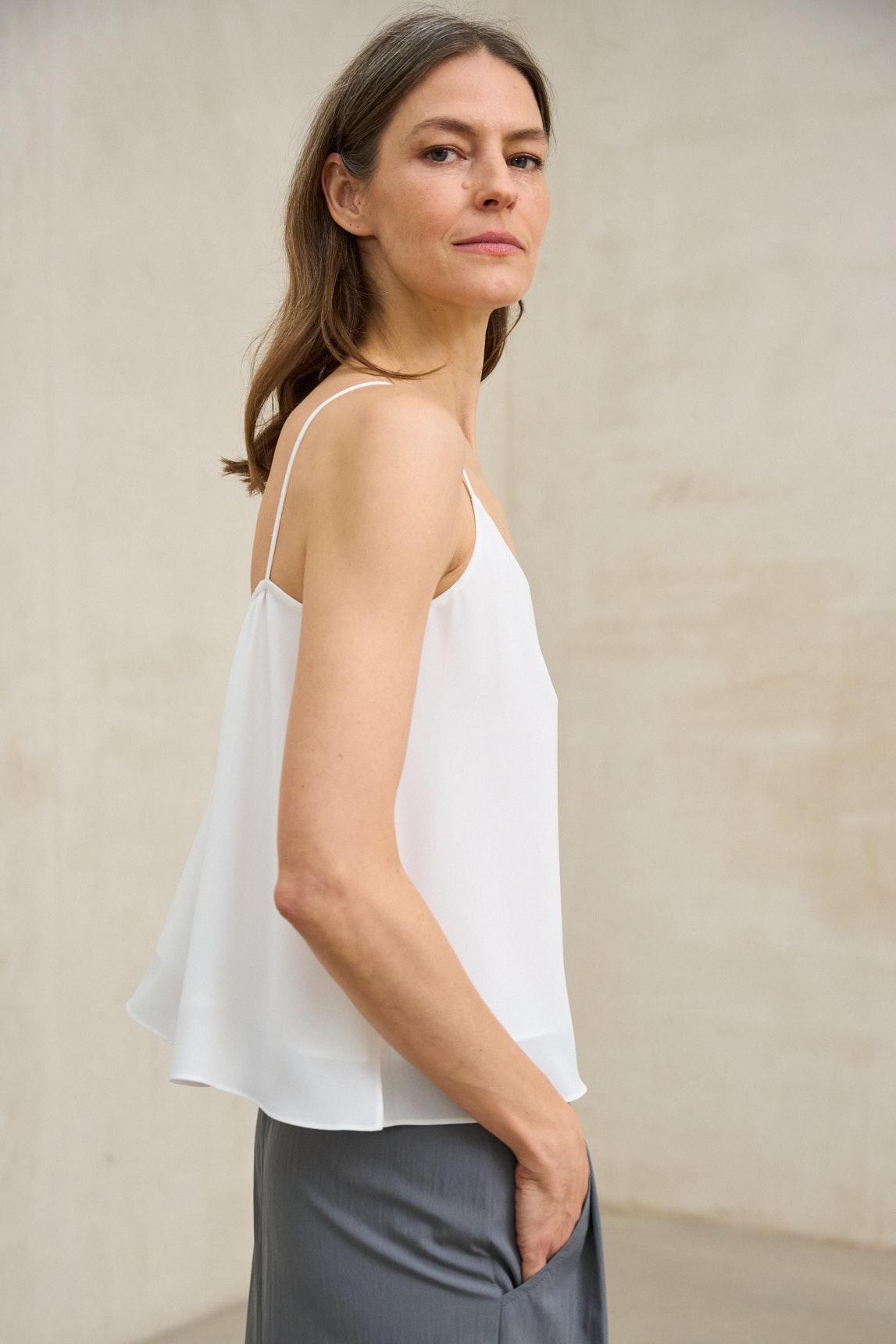 El top Alenia blanco roto es una prenda básica esencial de fondo de armario, diseñada para aportar ligereza, comodidad y versatilidad a cualquier conjunto. Confeccionado en tejido suave y agradable al tacto, se adapta al cuerpo sin marcar, ofreciendo una silueta limpia y favorecedora. Presenta escote redondo y diseño sin mangas, lo que lo convierte en una pieza perfecta para los meses cálidos o como base para looks por capas. Su tono blanco roto aporta calidez frente al blanco óptico, facilitando combinaciones con neutros, arena, gris o azul marino. Es ideal para llevar solo con pantalones fluidos o faldas, pero también funciona como prenda interior. Puede combinarse perfectamente debajo del jersey Lúvena, dejando que el tejido superior más ligero o translúcido aporte textura sin renunciar a una base discreta y elegante. Nos esforzamos por mostrar los colores de la forma más fiel posible, pero pueden variar ligeramente respecto a la realidad.