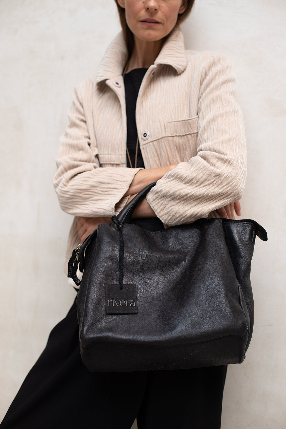 Este bolso de piel negro para mujer combina elegancia atemporal con funcionalidad. Fabricado en piel suave de alta calidad, ofrece una estructura flexible y amplia, perfecta para acompañarte en el día a día. Cuenta con doble asa de mano y una correa ajustable y extraíble para mayor versatilidad.