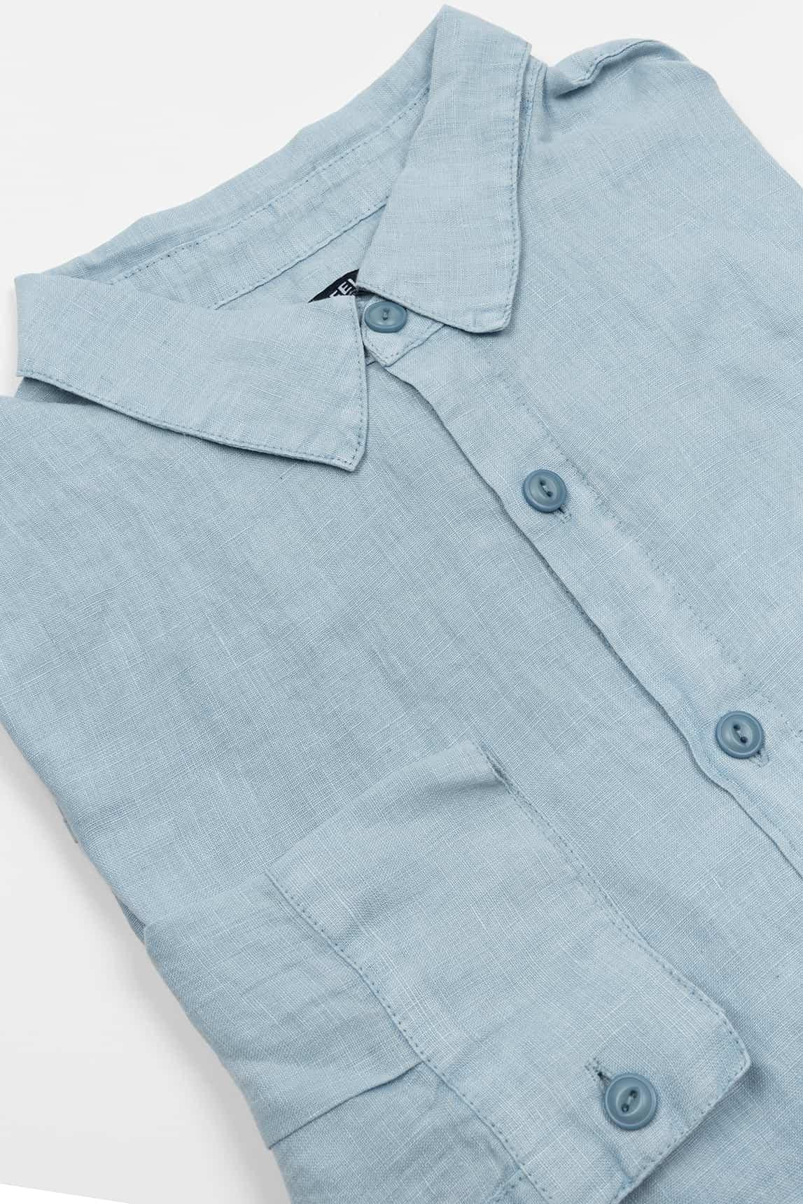 Camisa de hombre de manga larga en azul cielo, con diseño liso y silueta recta de apariencia ligera. Incorpora cuello clásico, cierre frontal de botones y puños abotonados, creando una imagen limpia y equilibrada. La superficie muestra una textura visual sutil que aporta relieve al color y refuerza su carácter natural, mientras la estructura favorece una caída cómoda y una sensación fresca en el conjunto.