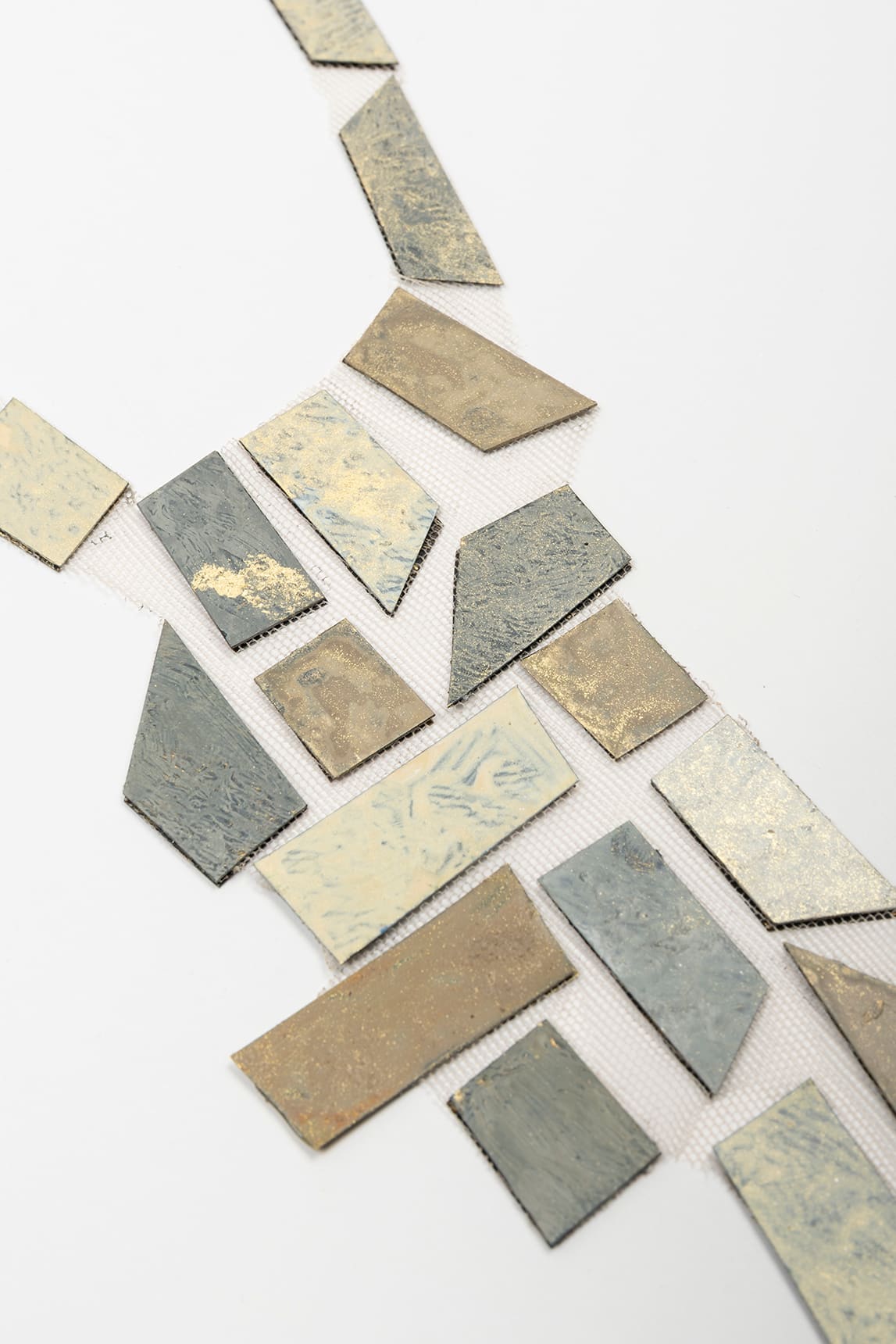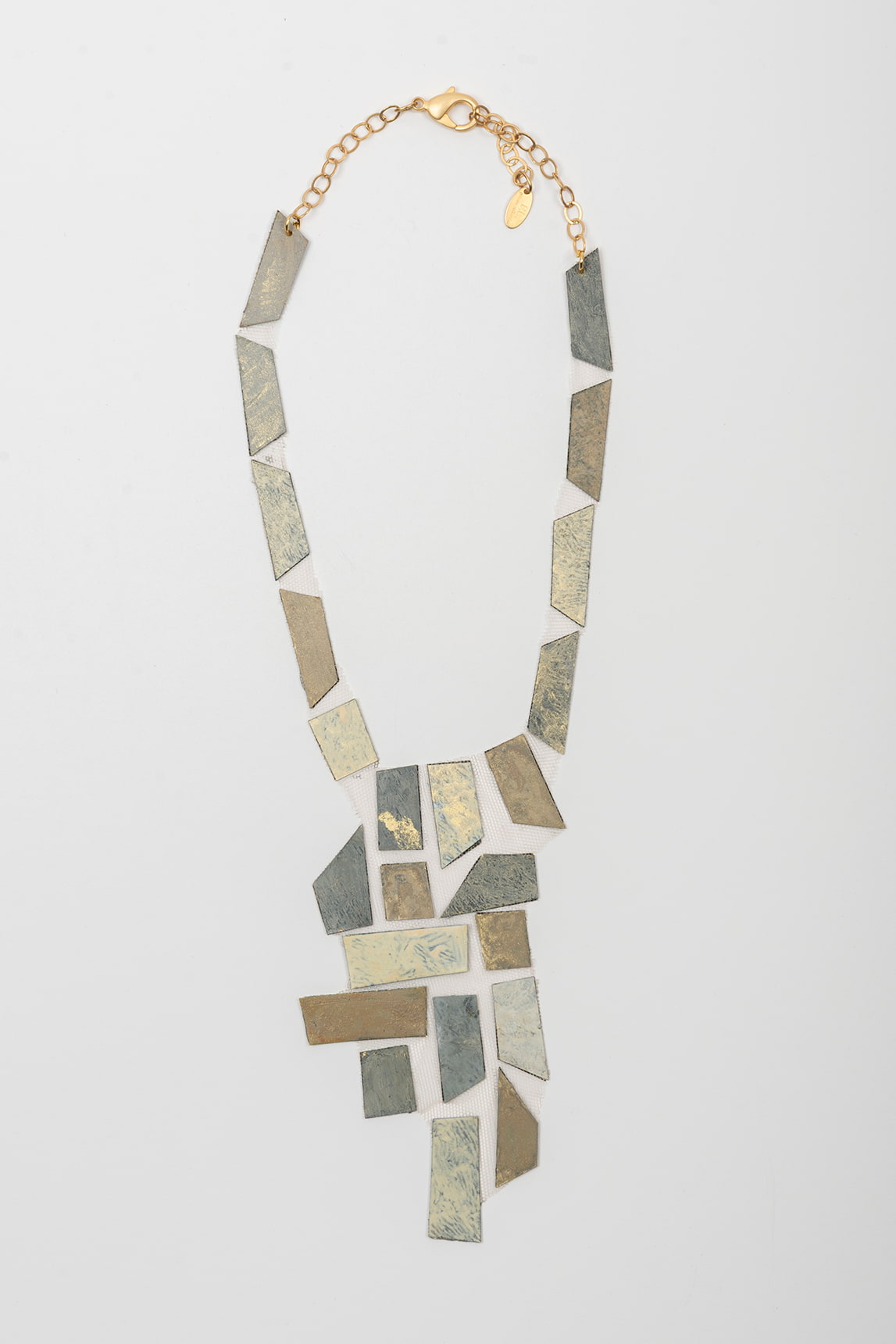 Collar de inspiración geométrica con cadena fina y cierre tipo mosquetón, acompañado de una extensión ajustable y pequeña placa colgante. El cuerpo se compone de piezas rectangulares articuladas, dispuestas como un mosaico en caída, con acabado mate texturizado que alterna reflejos suaves entre tonos claros y más profundos, aportando contraste y dimensión.