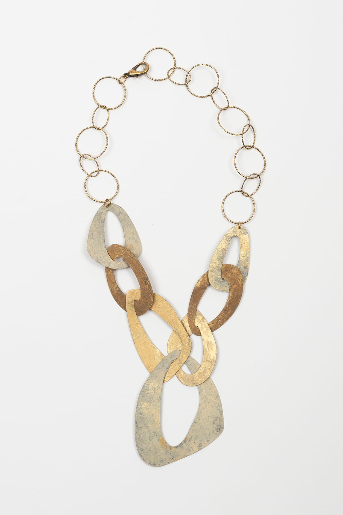 Collar corto de cadena en acabado dorado, compuesto por eslabones circulares amplios. En la parte frontal incorpora un conjunto de piezas planas de metal con formas orgánicas e irregulares, con acabado bicolor (dorado y plateado envejecido) y textura ligeramente moteada. Cierre superior con mosquetón y anilla.