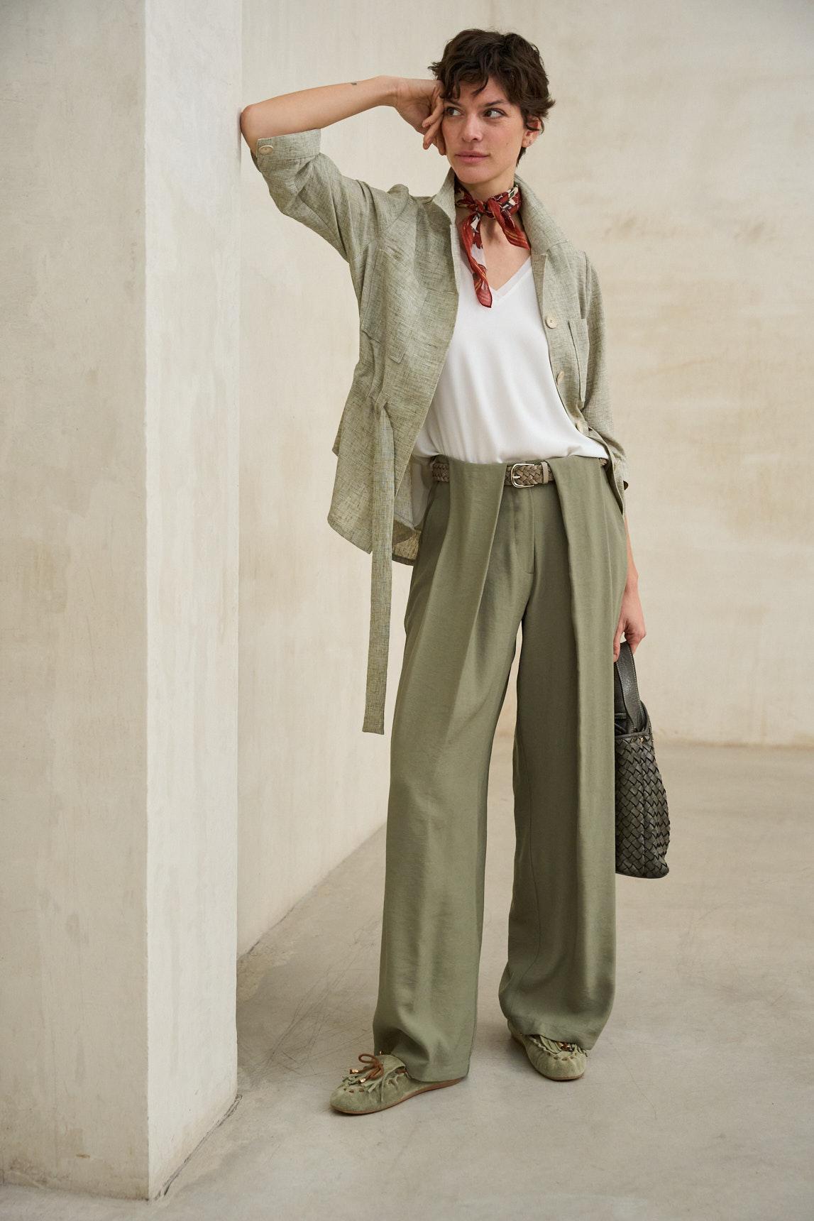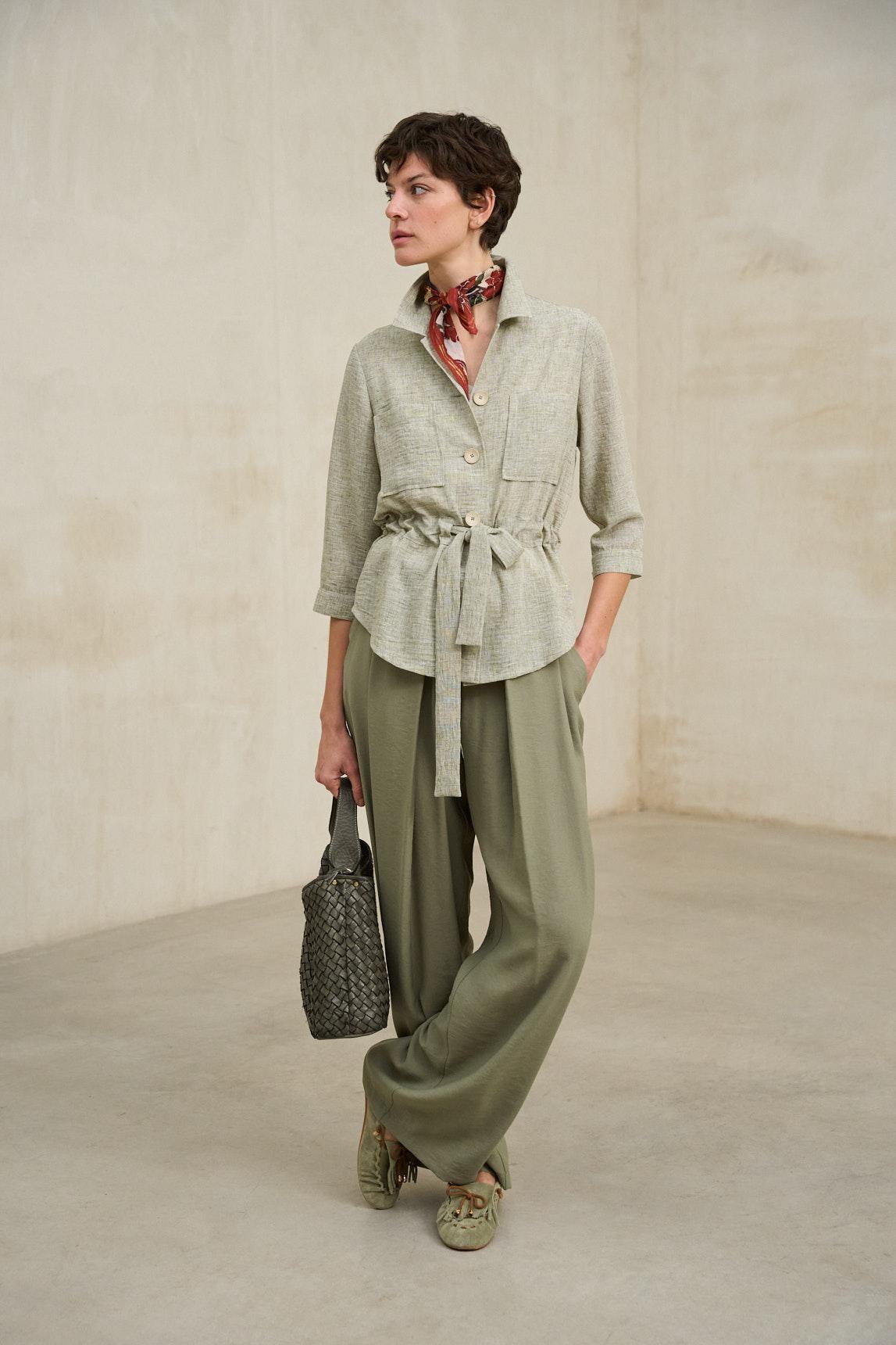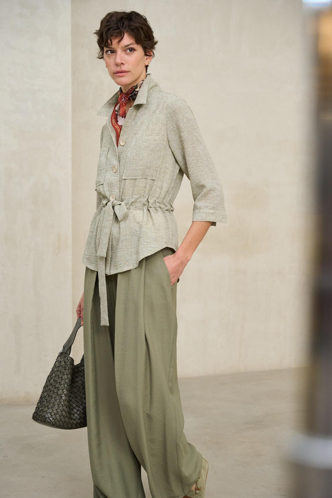 Chaqueta de mujer confeccionada en tejido ligero de tacto natural y acabado suave. Presenta cuello camisero, cierre frontal con botones y bolsillos de plastrón en el pecho que aportan funcionalidad y estructura. Incorpora cinturón del mismo tejido para ajustar la silueta y definir la cintura con un aire relajado y femenino. La Chaqueta Elvaya verde salvia destaca por su inspiración utilitaria reinterpretada en clave contemporánea. Su corte recto combinado con el cinturón permite llevarla tanto abierta como entallada, adaptándose a estilismos casuales o más pulidos. El tono verde salvia aporta frescura y sofisticación, integrándose fácilmente en looks neutros, blancos, arena o denim claro. Ideal para entretiempo, funciona como prenda exterior ligera o como pieza protagonista combinada con pantalones fluidos o faldas midi. Una chaqueta versátil que equilibra naturalidad y elegancia relajada. Nos esforzamos por mostrar los colores de la forma más fiel posible, pero pueden variar ligeramente respecto a la realidad.