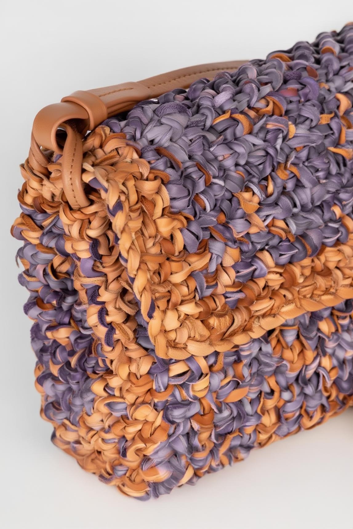 Bolso de hombro con diseño trenzado artesanal en tonos cuero y lila, una combinación que aporta textura, contraste y carácter. Su estructura rectangular con solapa frontal y cierre magnético lo convierte en una pieza práctica y fácil de llevar en el día a día.