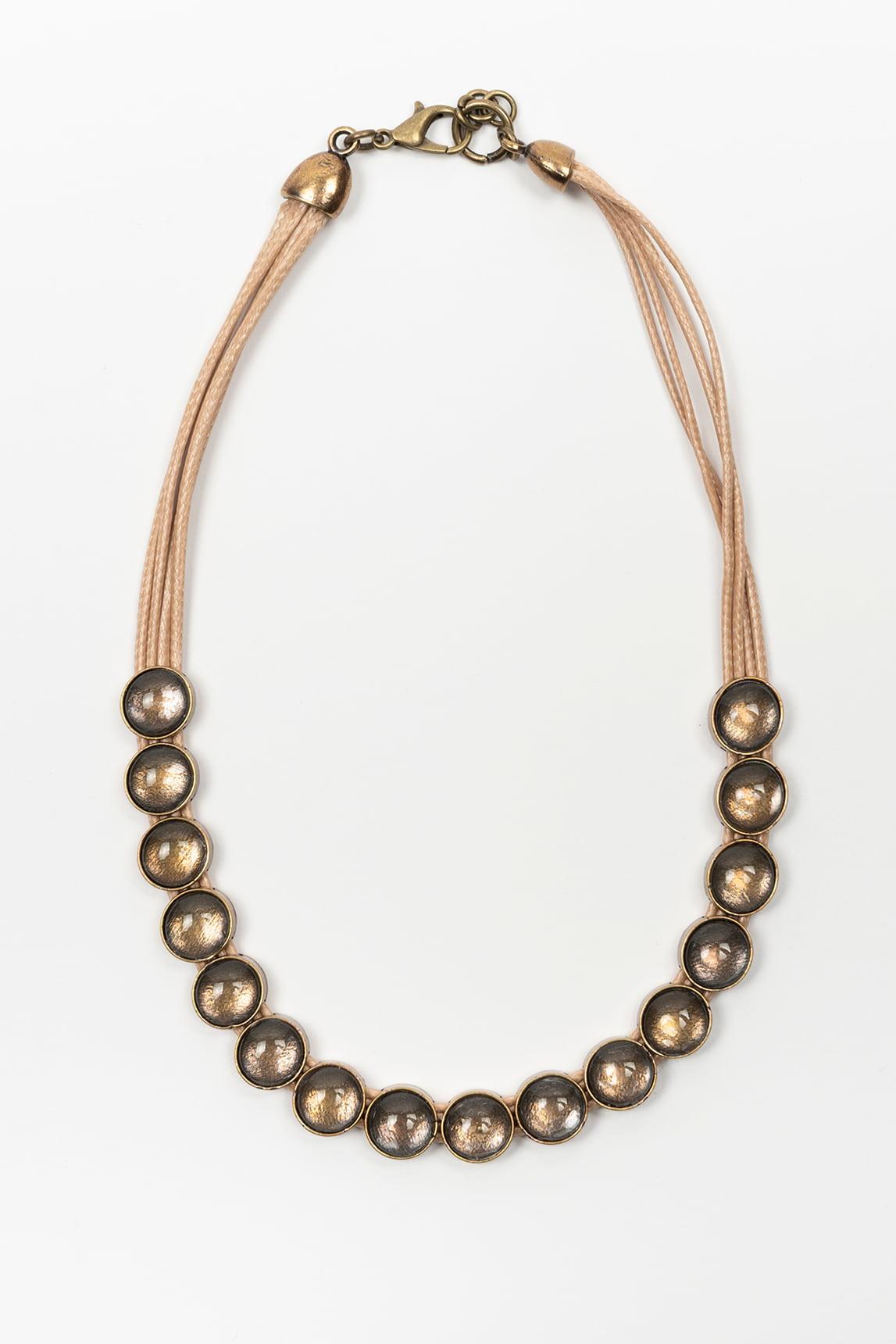 El collar Brisea en latón presenta la misma composición de esferas centrales acompañadas por varias hebras finas que aportan textura y dimensión. Su diseño estructurado equilibra modernidad y un aire artesanal sutil.