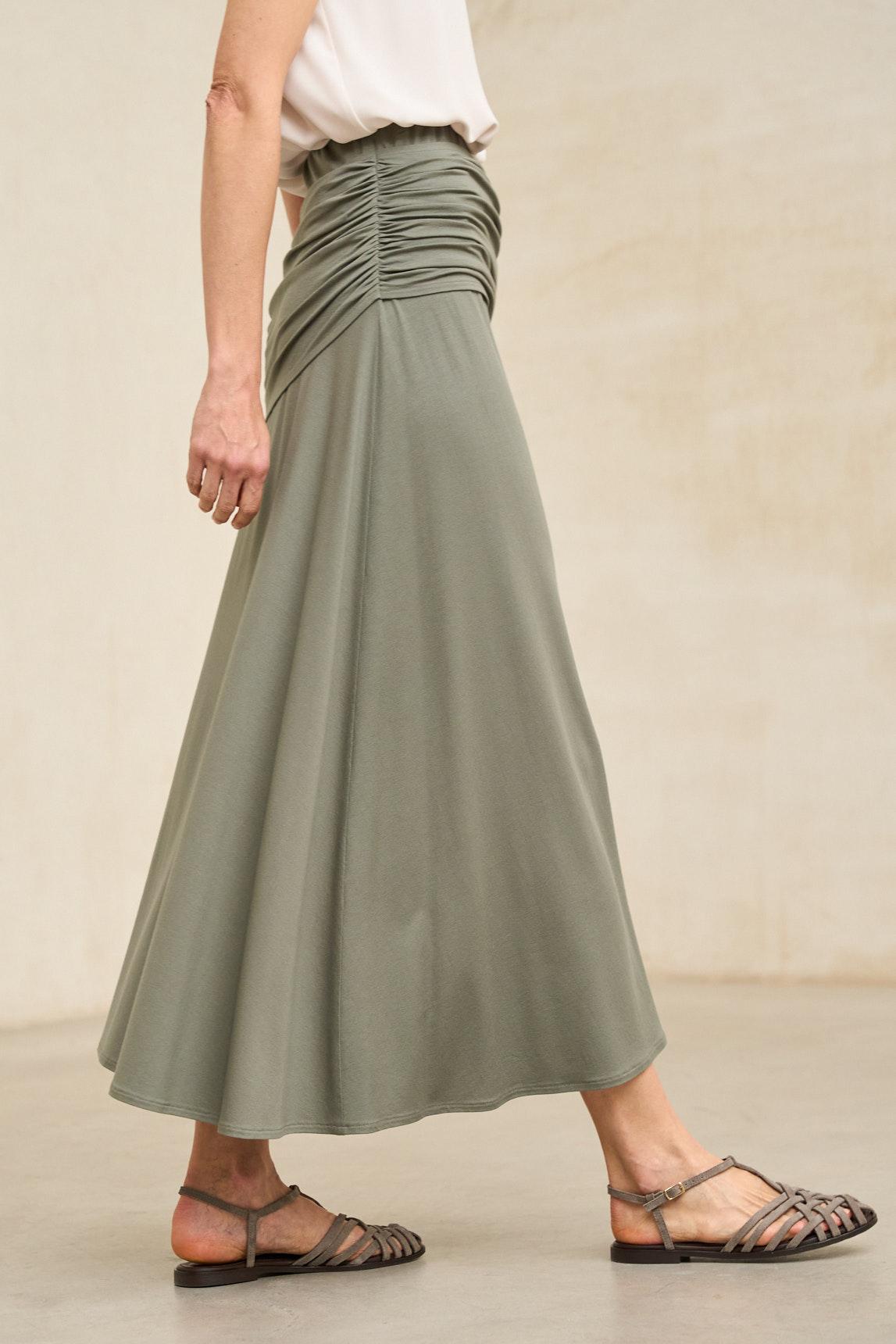 Viktoria mide 180 cm y lleva una talla 34. Falda de mujer confeccionada en tejido de punto fluido con una caída elegante y suave. Diseño largo con efecto drapeado en la parte superior que aporta movimiento y realza la silueta de forma natural. Cintura alta con banda ancha que proporciona sujeción y comodidad, favoreciendo un ajuste perfecto sin perder ligereza. La Falda Kaia caqui combina sofisticación y versatilidad. Su color neutro y su estructura fluida la convierten en una prenda ideal tanto para estilismos de día con sandalias planas como para looks más refinados con tacón o camisa estructurada. Nos esforzamos por mostrar los colores de la forma más fiel posible, pero pueden variar ligeramente respecto a la realidad.