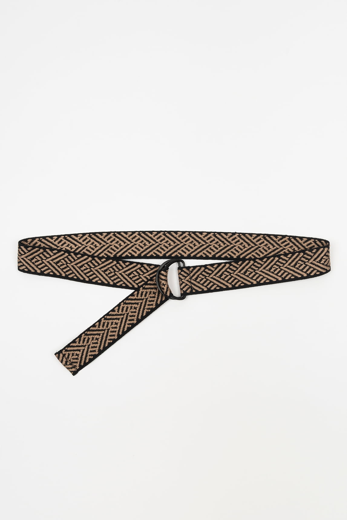 - Cinturón con estampado geométrico en tonos beige y negro.