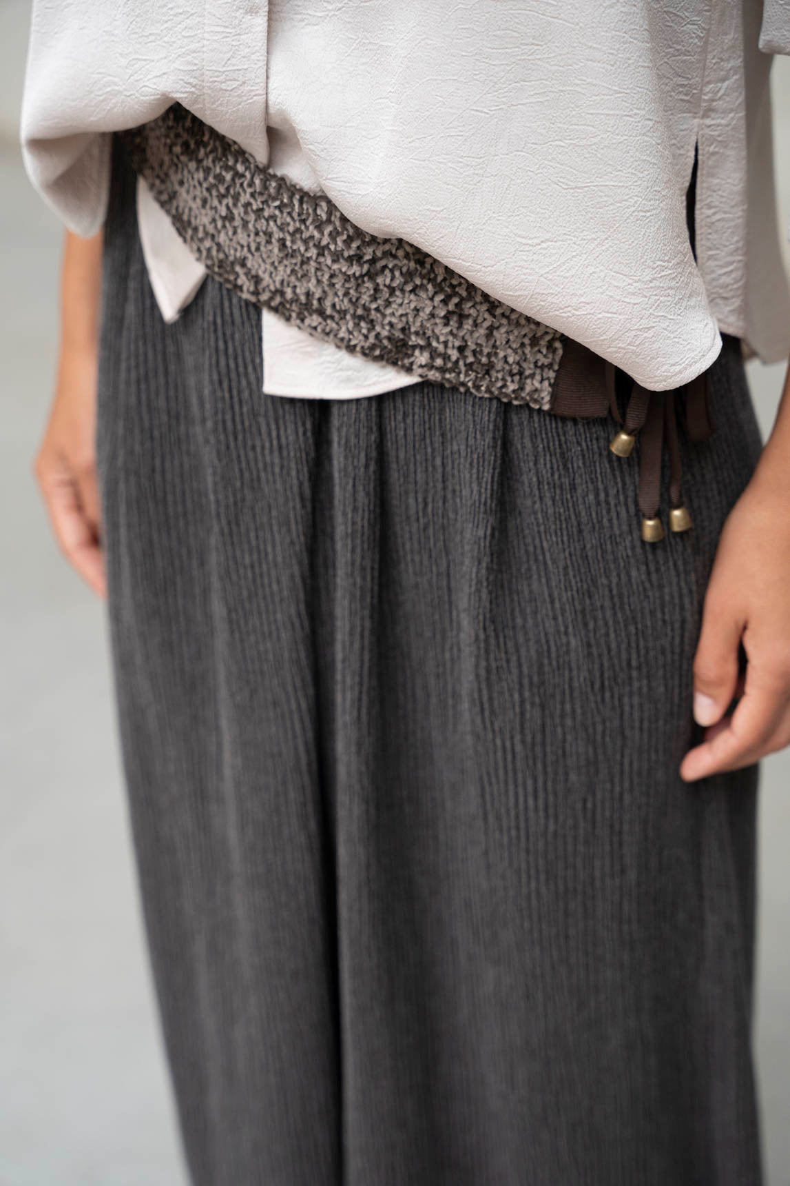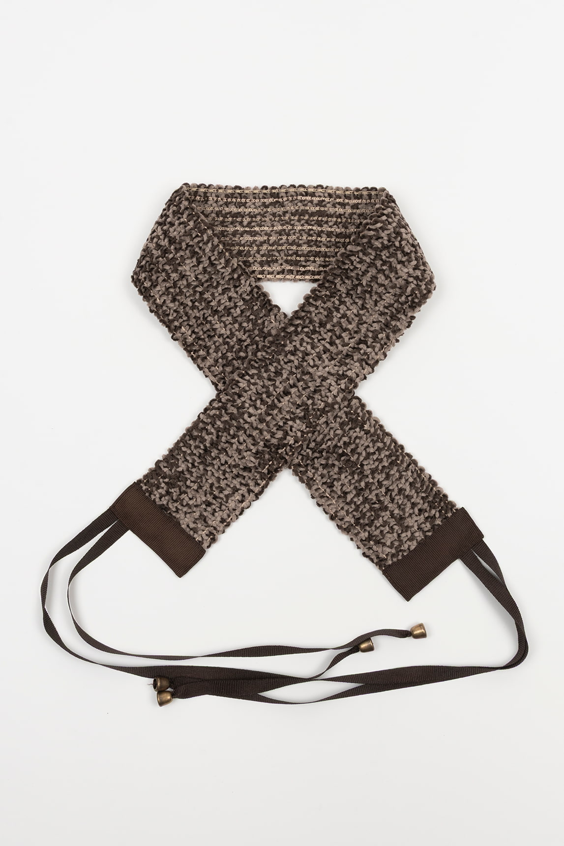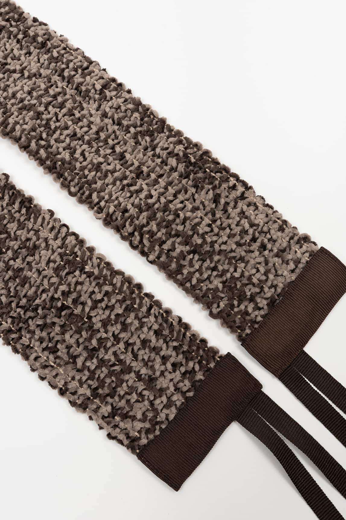 - Fajín elástico con textura bouclé en tonos marrón y topo.