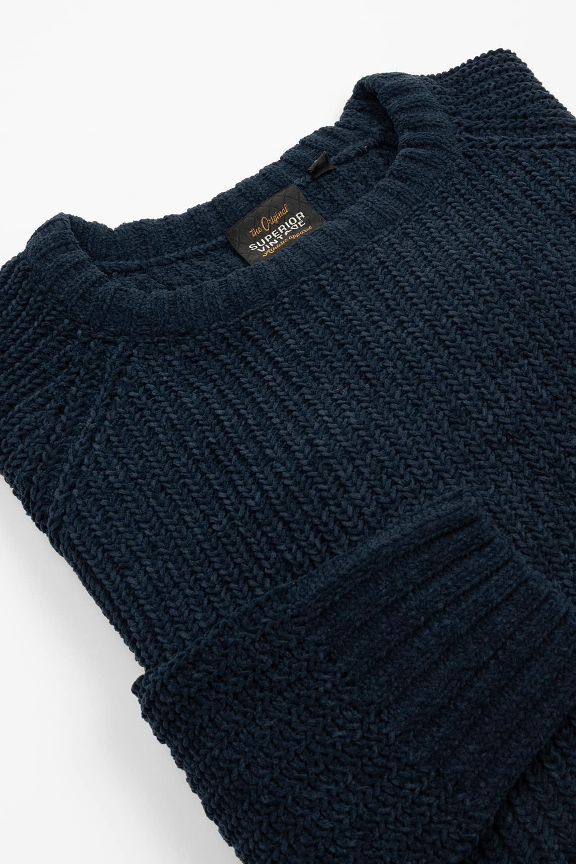Este jersey de Superior es un básico de invierno con carácter: el punto marcado y el tono marino combinan con vaqueros, chinos o sobrecamisas para un look casual y robusto.