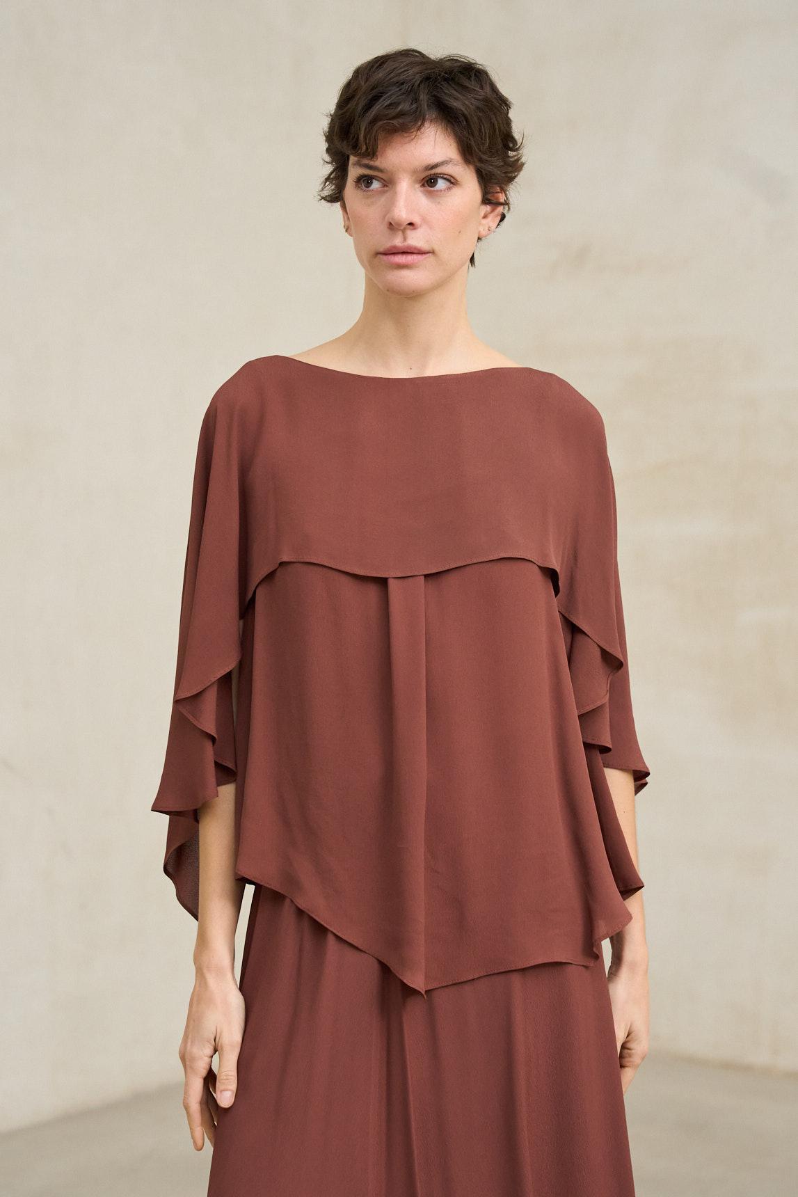 La Blusa Támara terracota es una pieza fluida y sofisticada que destaca por su diseño relajado y su silueta envolvente. Confeccionada en un tejido ligero de caída suave, presenta escote barco y manga amplia tipo capa que aporta movimiento y un aire contemporáneo al conjunto. Su diseño incorpora una capa frontal superpuesta que genera volumen y profundidad visual, estilizando la figura sin marcar. El tono teja, cálido y favorecedor, refuerza su carácter elegante y la convierte en una prenda ideal tanto para ocasiones especiales como para estilismos más relajados combinada con pantalones amplios o faldas fluidas. La Blusa Támara terracota es una opción versátil dentro del armario femenino: cómoda, ligera y con un diseño diferencial que eleva cualquier look sin esfuerzo. Nos esforzamos por mostrar los colores de la forma más fiel posible, pero pueden variar ligeramente respecto a la realidad.