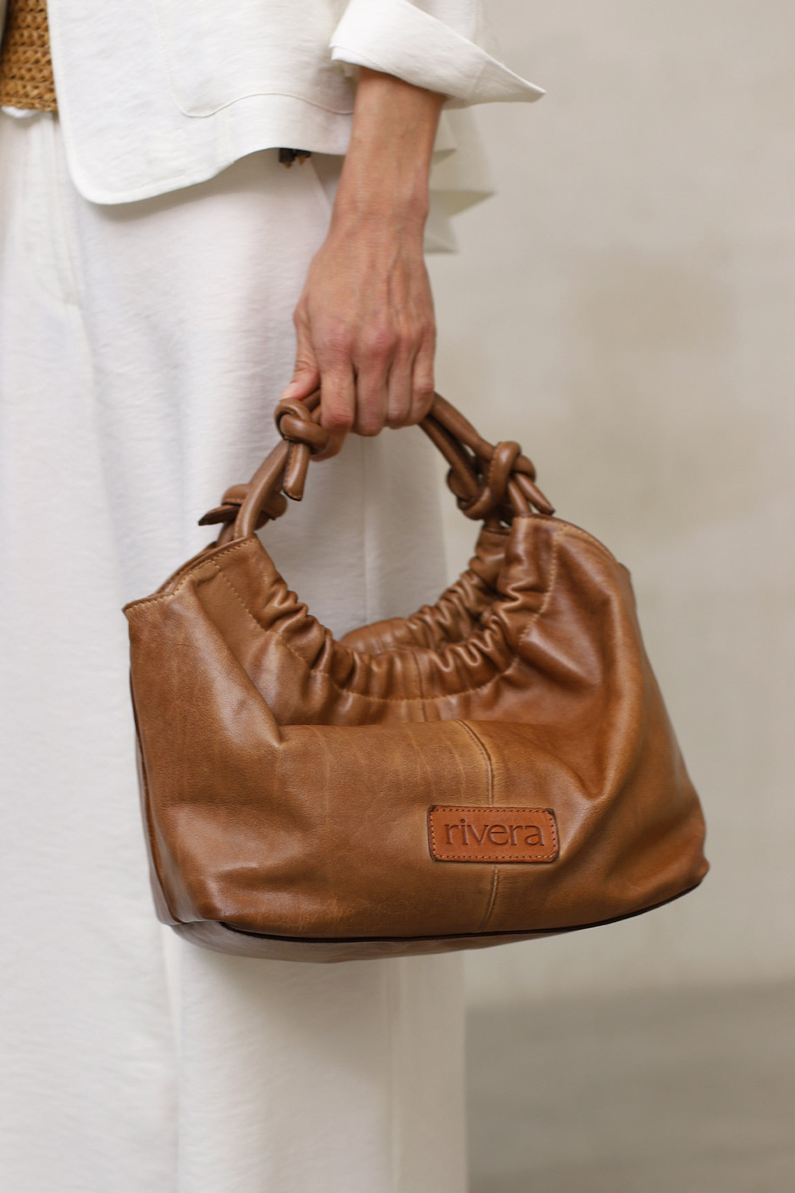 El bolso Alide de Rivera en tono cuero combina el encanto del diseño artesanal con la funcionalidad moderna. Su piel genuina, suave y resistente, ofrece un tacto agradable y un aspecto natural que mejora con el tiempo. El detalle fruncido y las asas anudadas aportan carácter y estilo, convirtiéndolo en el complemento ideal para cualquier ocasión.