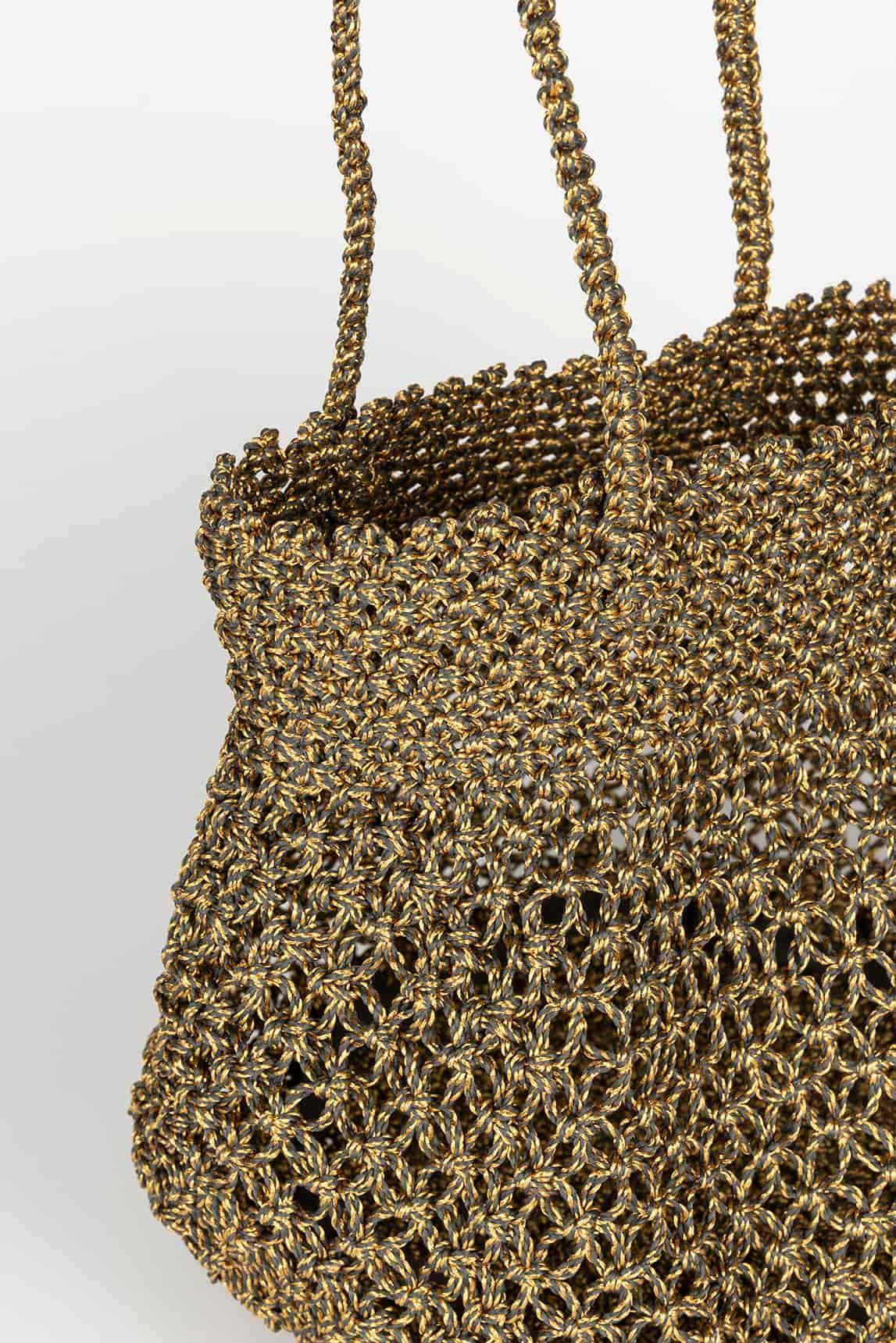 El tejido trenzado metalizado genera un efecto luminoso continuo con matices más intensos, aportando profundidad y carácter al diseño. Su silueta redondeada suaviza el conjunto y equilibra el protagonismo del acabado brillante, creando un bolso elegante, femenino y actual. El asa larga integrada permite llevarlo cómodamente al hombro, manteniendo una caída ligera y natural.