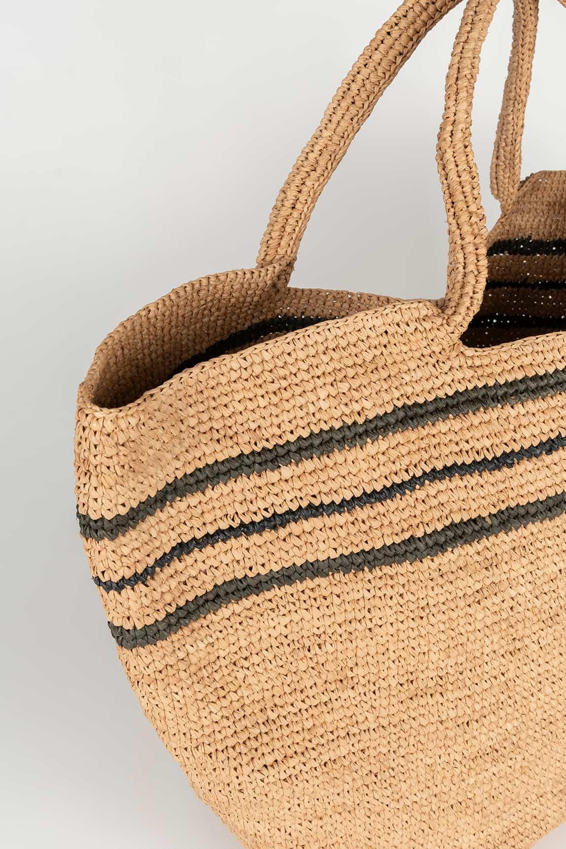 Con medidas de 46 × 50 × 18 cm y asa de 17 × 19 cm, ofrece capacidad suficiente para llevar cartera, móvil, gafas de sol y pequeños esenciales. Es una opción perfecta como bolso de rafia estructurado, bolso natural con rayas o complemento artesanal para la temporada primavera-verano.