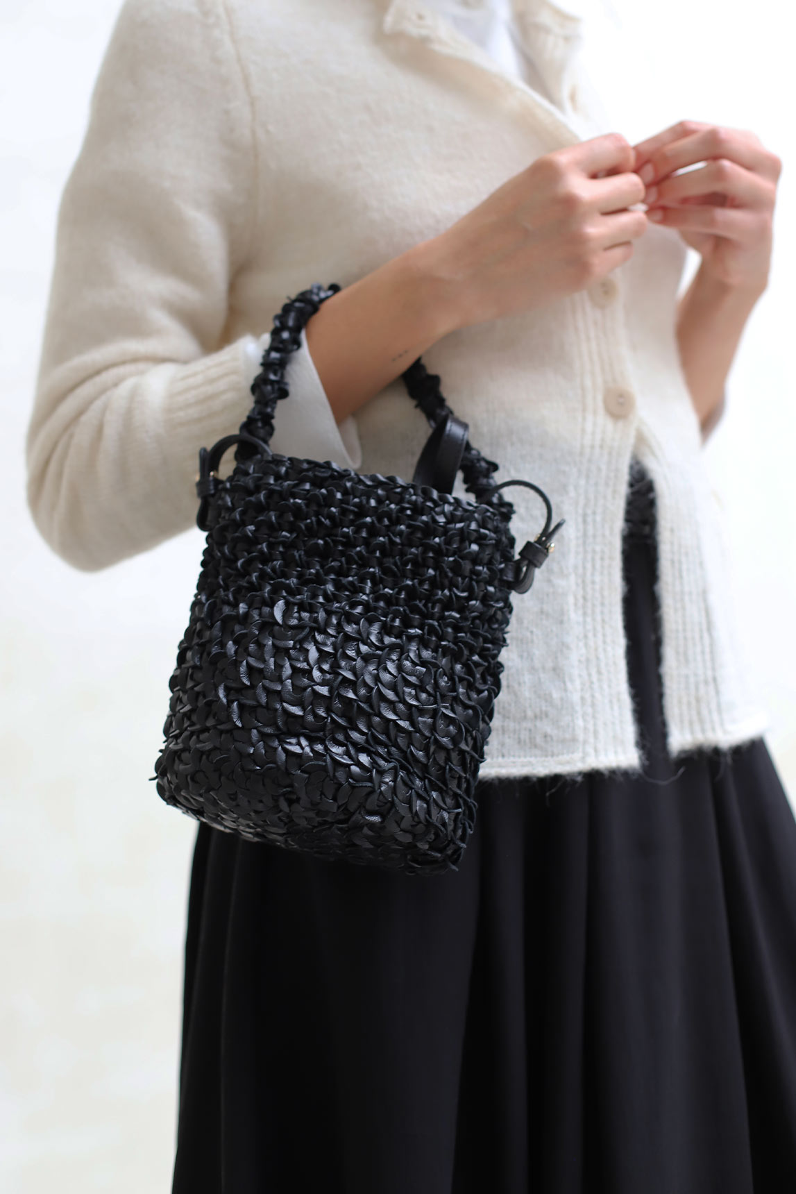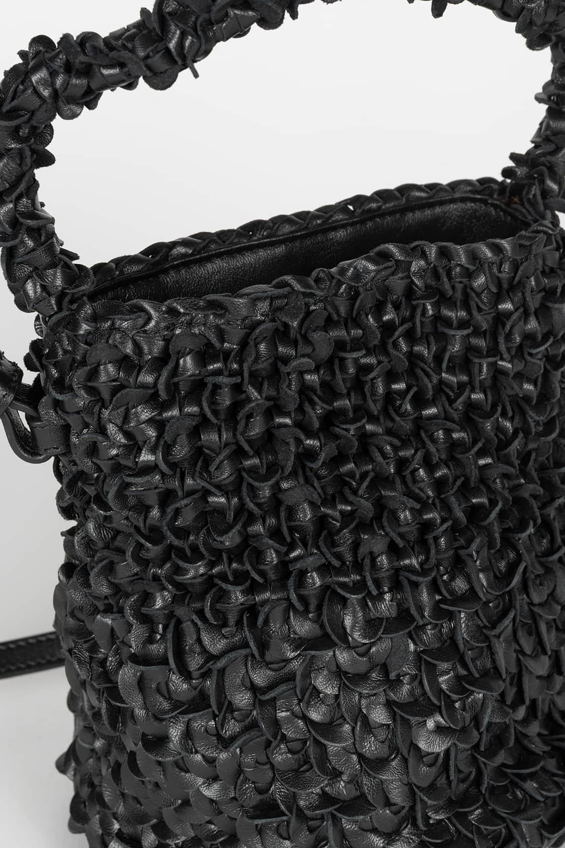 Bolso tipo bombonera confeccionado en piel trenzada artesanalmente, con un sofisticado acabado negro intenso que lo convierte en una pieza versátil y atemporal. Su diseño estructurado aporta presencia, mientras que la textura trenzada le da un toque contemporáneo con carácter propio.