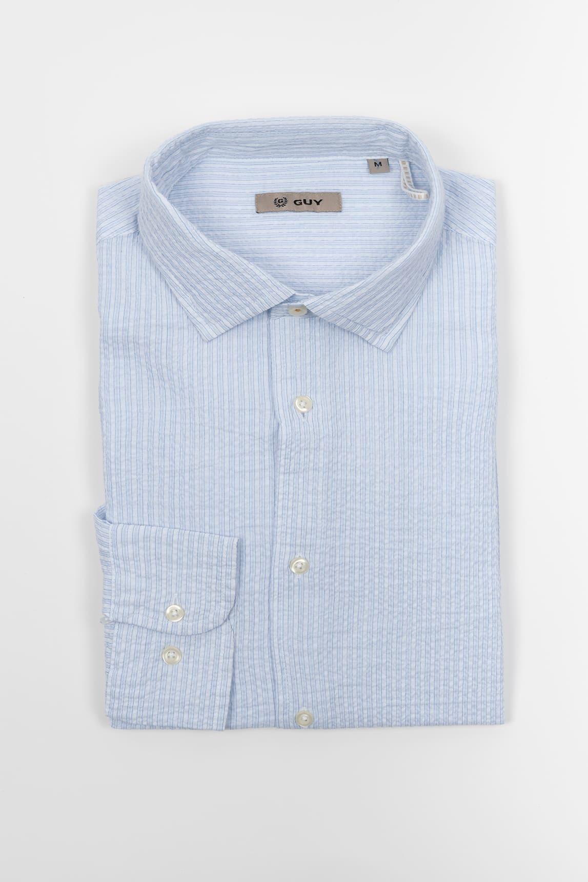 Camisa de manga larga con silueta recta y diseño de raya vertical fina en tono azul cielo sobre fondo claro. Presenta cuello clásico, cierre frontal de botones vistos y puño abotonado, con una superficie de textura visual suave que aporta naturalidad y un acabado ligero. La línea del dibujo vertical estiliza el conjunto y refuerza una imagen limpia, luminosa y muy fácil de combinar.