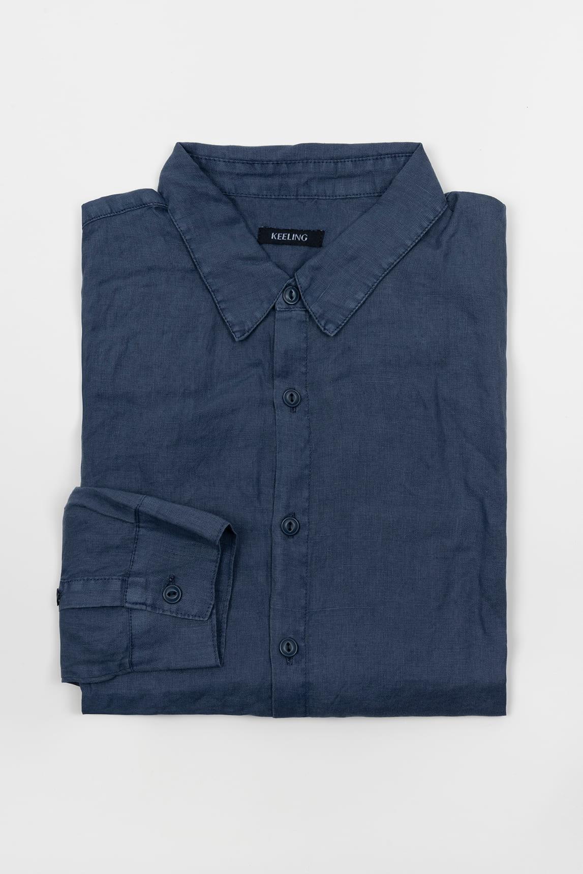 Camisa de hombre de manga larga en azul marino, con silueta recta y una superficie de textura arrugada que aporta movimiento visual y un acabado natural. El diseño incorpora cuello clásico, cierre frontal de botones al tono y puños abotonados, manteniendo una imagen limpia con un punto desenfadado. La estructura ligera favorece una caída cómoda y convierte el color oscuro en una base sobria con más profundidad.