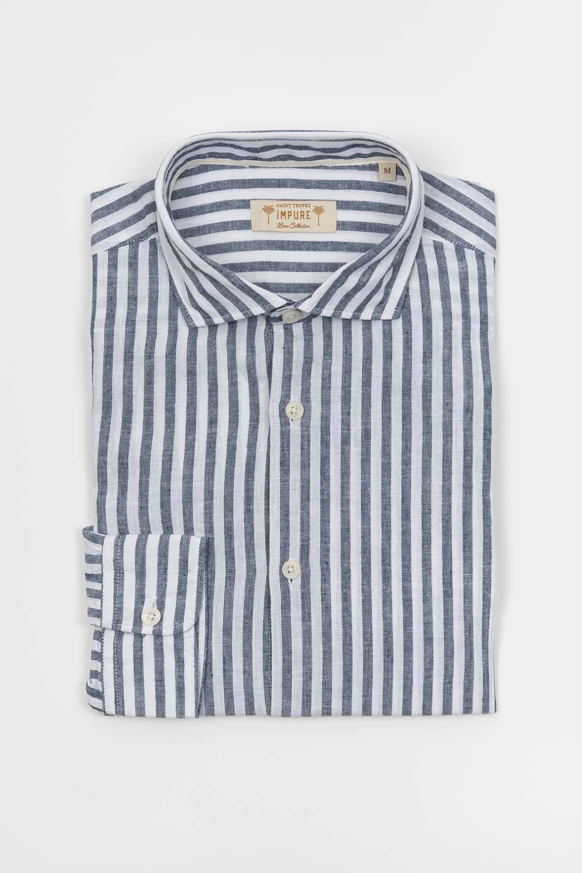 Camisa de lino de manga larga en azul marino con raya vertical en contraste claro, diseñada con una silueta recta y un acabado visual ligero. Presenta cuello clásico de estructura blanda, cierre frontal de botones y puño abotonado, manteniendo una imagen equilibrada entre lo pulido y lo relajado. El patrón de raya aporta definición al conjunto y refuerza su verticalidad, mientras la textura natural del lino suaviza la formalidad del diseño y añade un matiz fresco y auténtico.