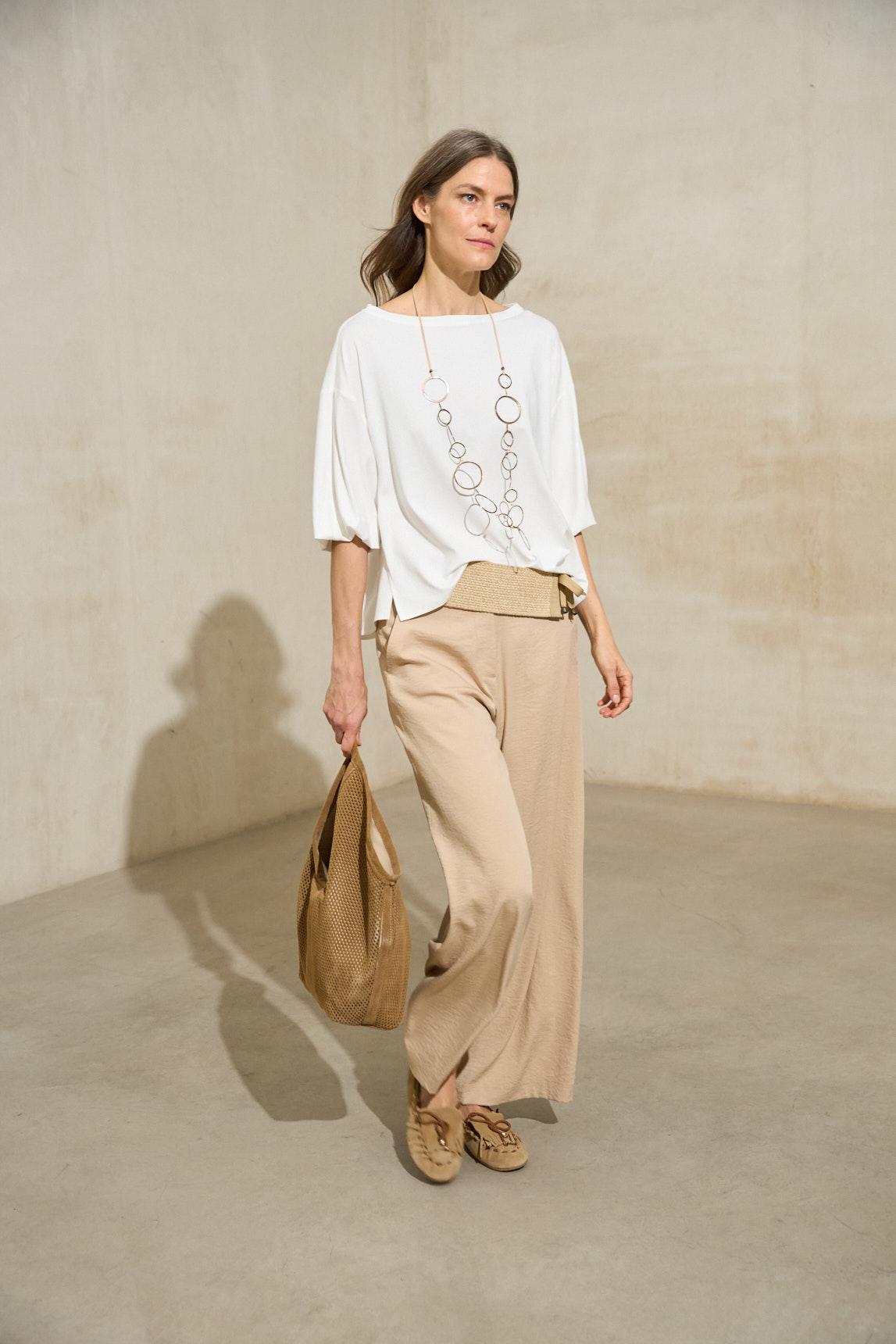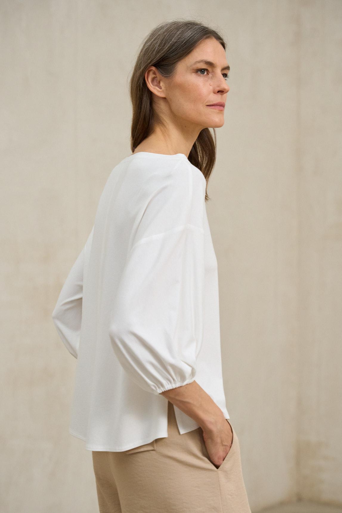 Camiseta de mujer confeccionada en tejido de punto ligero con tacto suave y caída natural. Escote barco, manga larga con frunce elástico en el puño y silueta fluida que aporta un aire desenfadado y femenino. La Camiseta Eira blanco se distingue por su elegancia sencilla y su versatilidad. Su tono neutro combina con toda la paleta de la temporada y resulta ideal para looks de diario o conjuntos más refinados. Una prenda básica elevada, cómoda y atemporal. Nos esforzamos por mostrar los colores de la forma más fiel posible, pero pueden variar ligeramente respecto a la realidad.