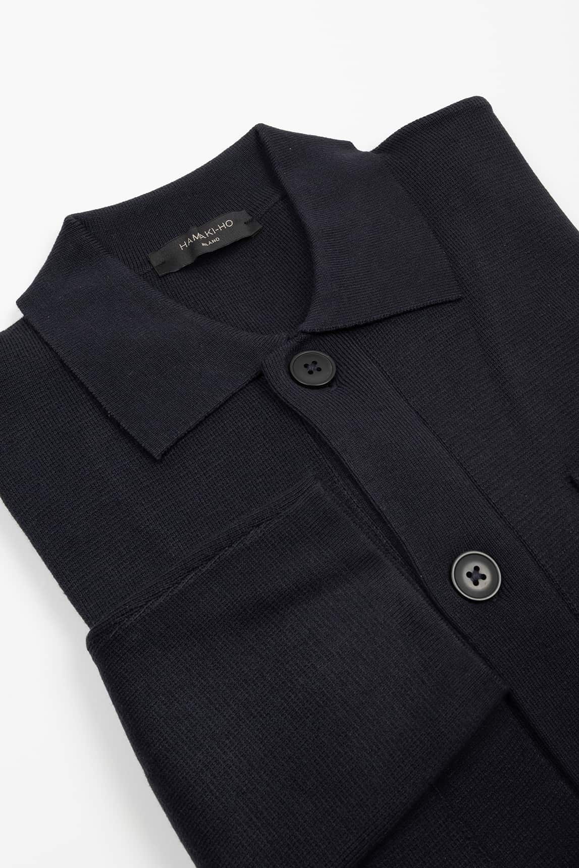 - Cuello camisero y cierre frontal de botones estilo sobrecamisa.