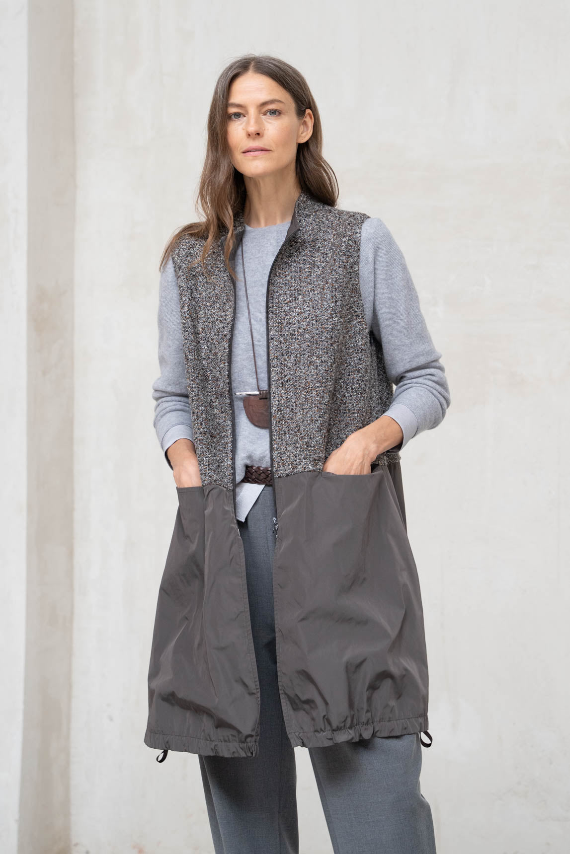 El chaleco Mantova combinado gris es una pieza versátil que aporta calidez y estilo a tus looks de temporada. Su diseño mixto une la textura clásica del tweed con un toque funcional gracias al tejido técnico, creando un equilibrio perfecto entre elegancia y practicidad. Perfecto para combinar con jerséis, camisas o camisetas en estilismos tanto urbanos como casuales.