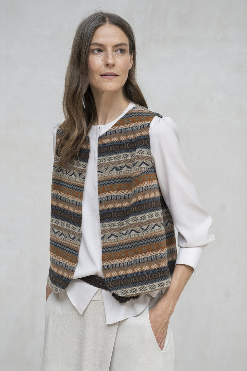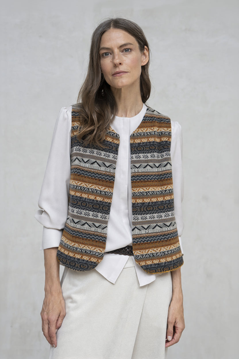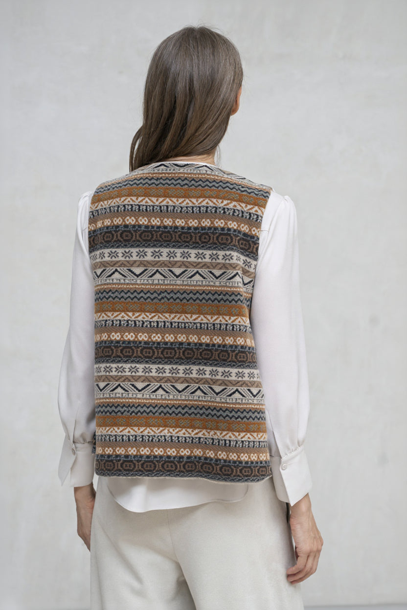 - Chaleco abierto sin cierre, confeccionado en tejido suave en tonos grises con diseño geométrico y étnico característico.