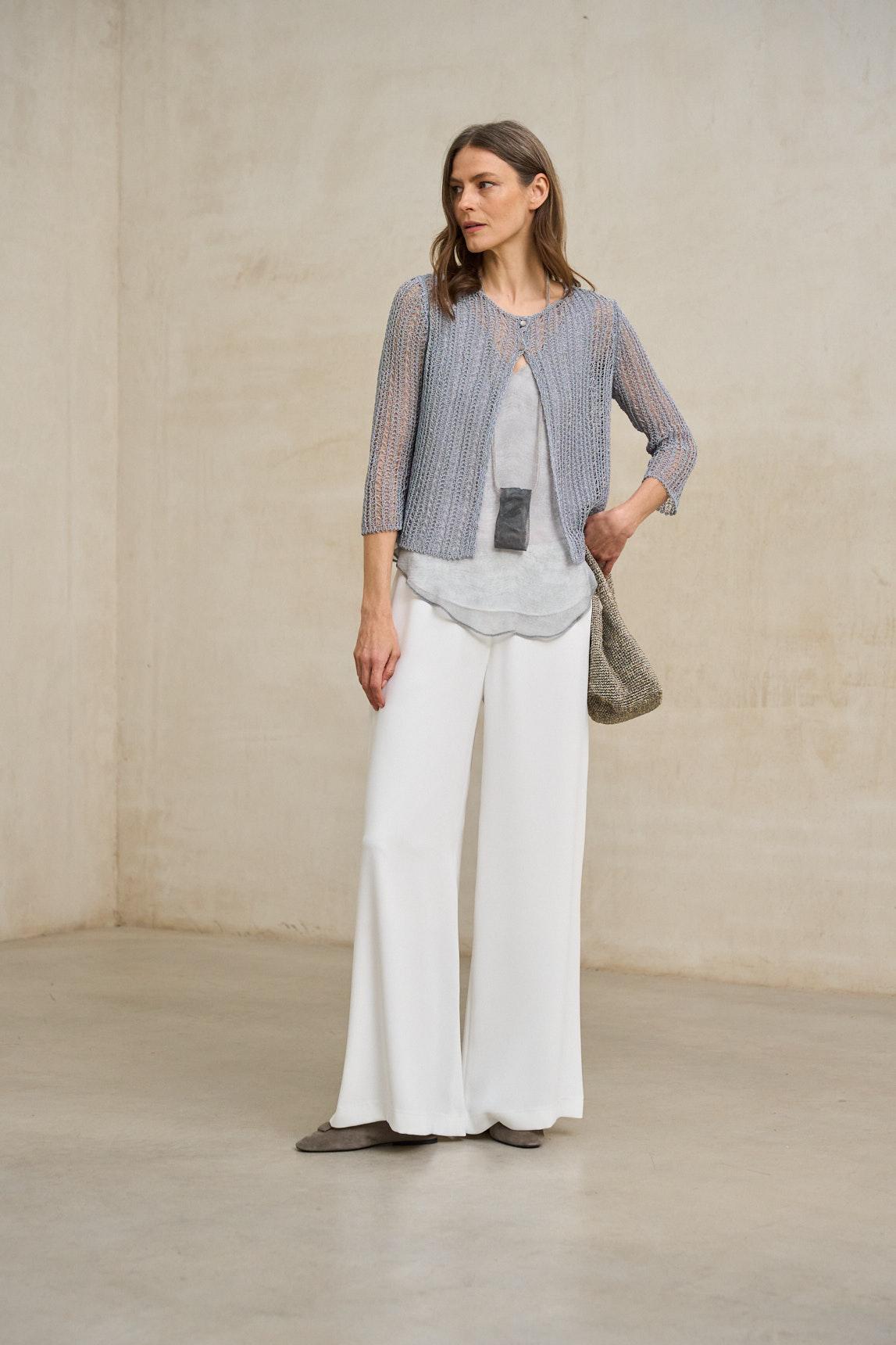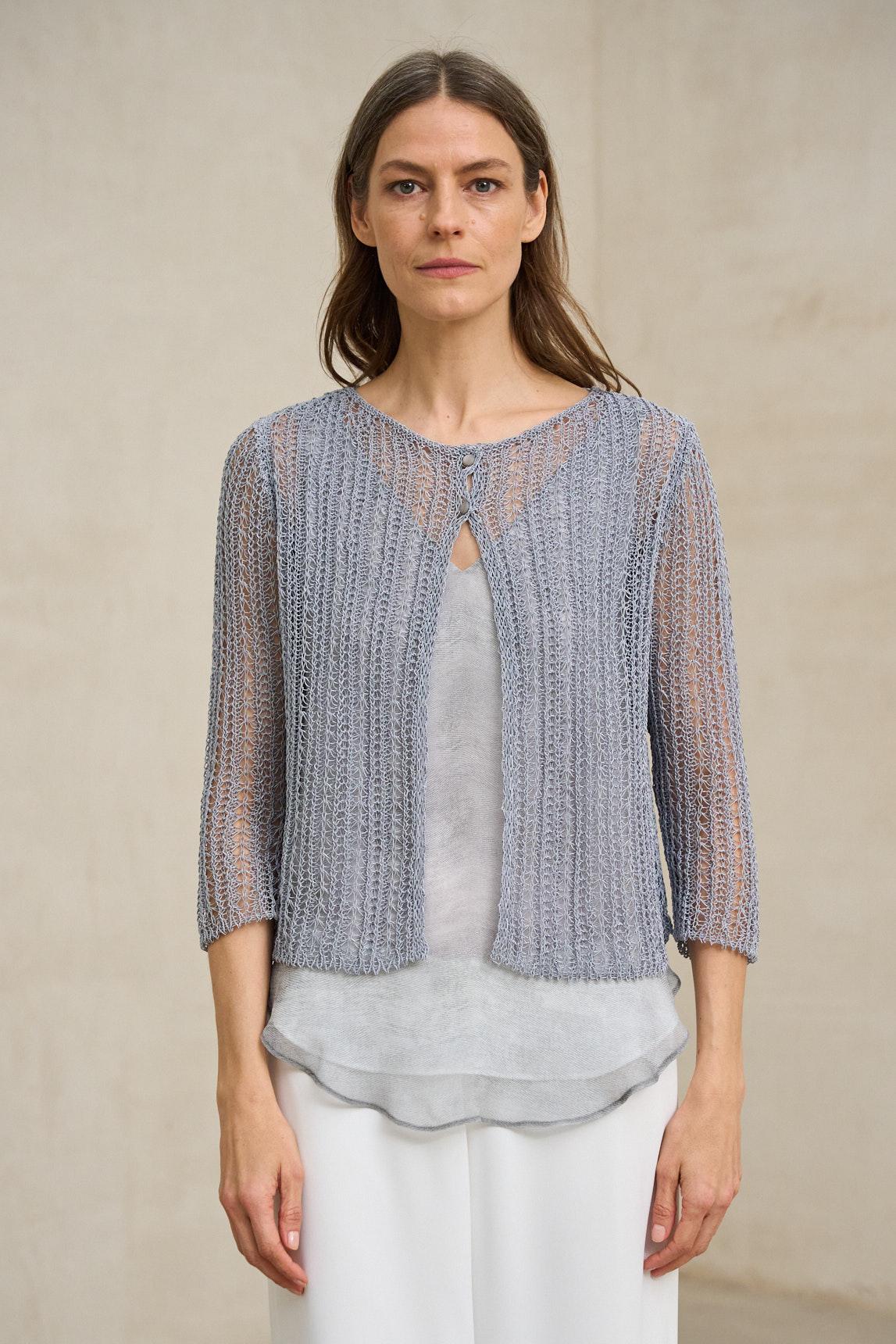 Chaqueta de mujer confeccionada en tejido de punto ligero con textura calada y acabado etéreo. Su estructura fluida y su construcción abierta permiten que la prenda acompañe el movimiento con naturalidad, creando un efecto vaporoso y sofisticado.