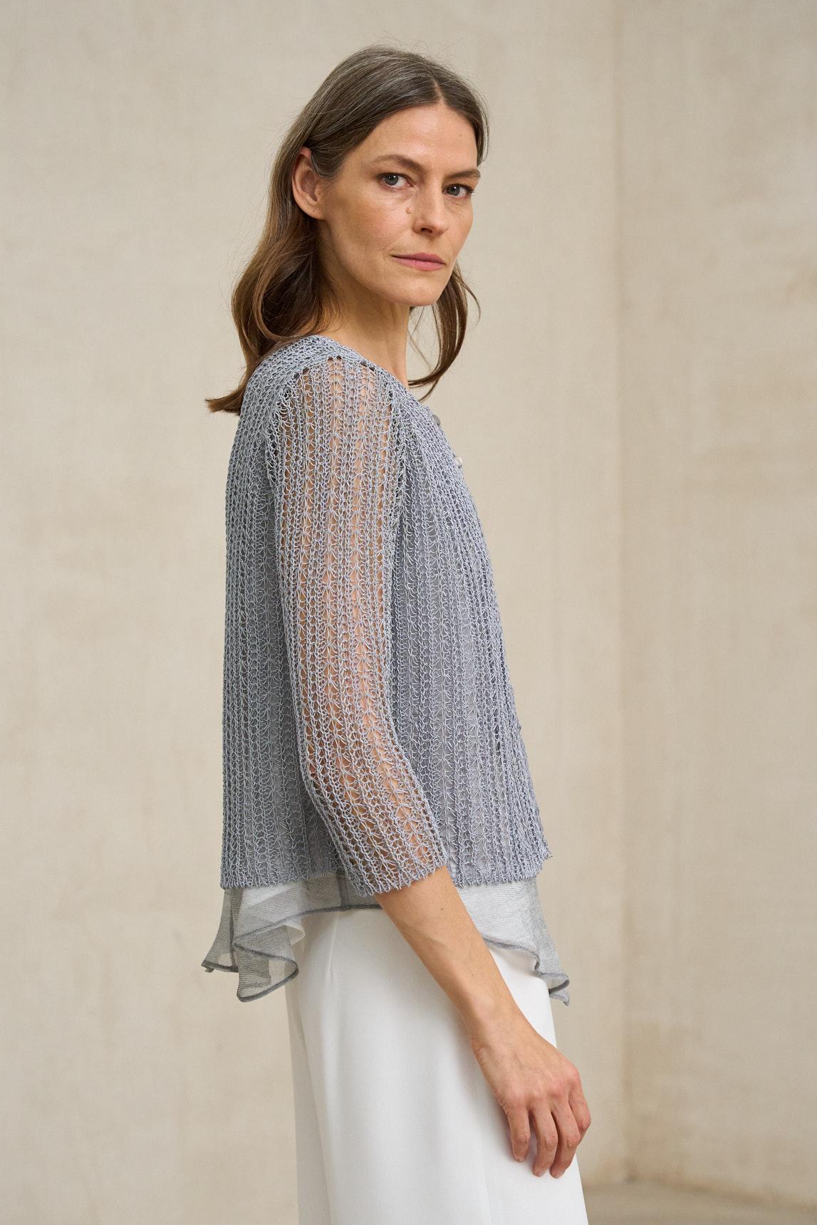 El diseño presenta manga tres cuartos y caída recta, sin cierres, lo que refuerza su carácter ligero. El tejido, de transparencia delicada y elegante, aporta profundidad visual y convierte la prenda en una capa ideal para superponer.