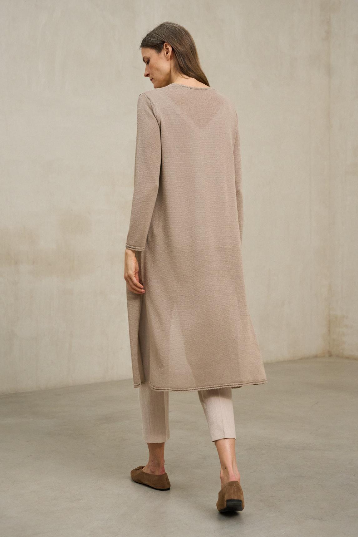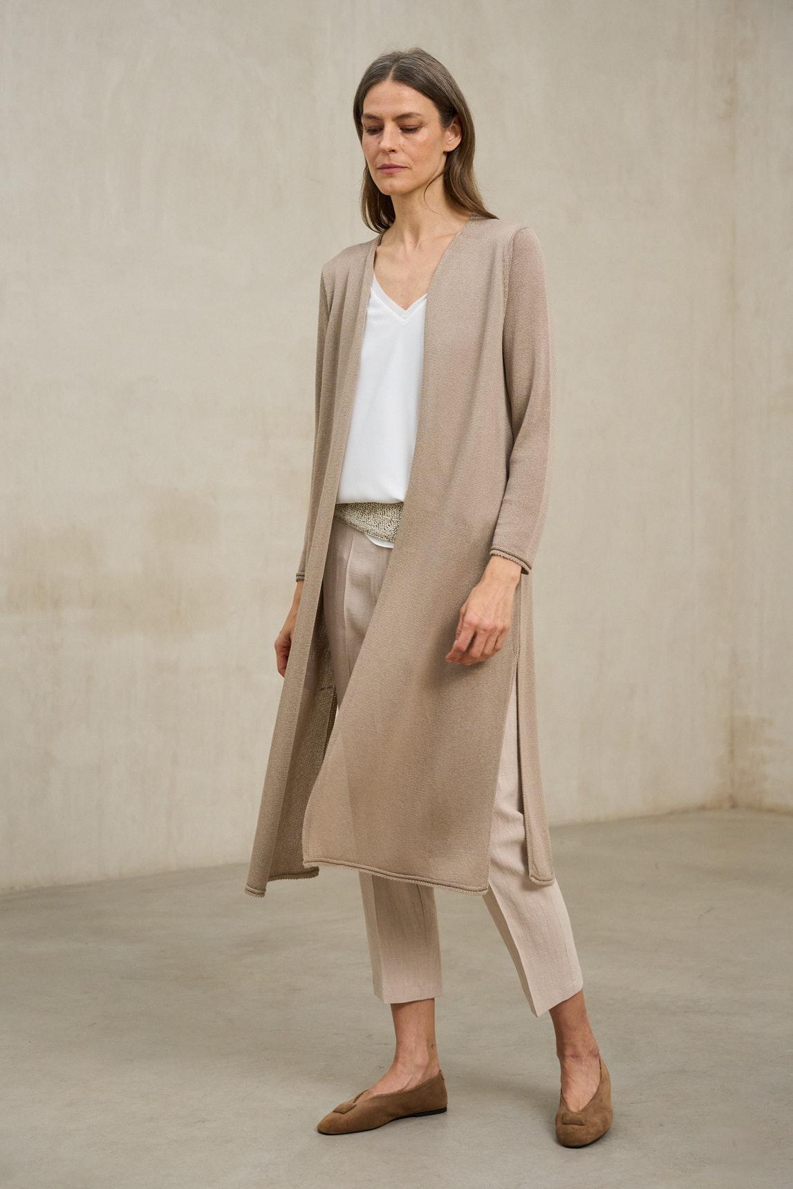 La chaqueta de punto Avelin arena es una prenda larga y fluida diseñada para aportar ligereza y sofisticación a los estilismos de entretiempo. Su silueta abierta, sin cierre, cae con naturalidad desde los hombros, creando una línea vertical que estiliza y alarga la figura. Confeccionada en tejido de punto suave y ligero, presenta manga larga y un bajo ligeramente evasé que aporta movimiento al caminar. El tono arena, neutro y atemporal, facilita múltiples combinaciones y refuerza su carácter versátil dentro de un armario elegante y funcional. Ideal para llevar sobre conjuntos monocromáticos o sobre pantalones fluidos y tops básicos, la chaqueta de punto Avelin arena se adapta tanto a looks de oficina como a propuestas más relajadas. Es una pieza pensada para superponer sin añadir peso, aportando estructura suave y equilibrio al conjunto. Nos esforzamos por mostrar los colores de la forma más fiel posible, pero pueden variar ligeramente respecto a la realidad.