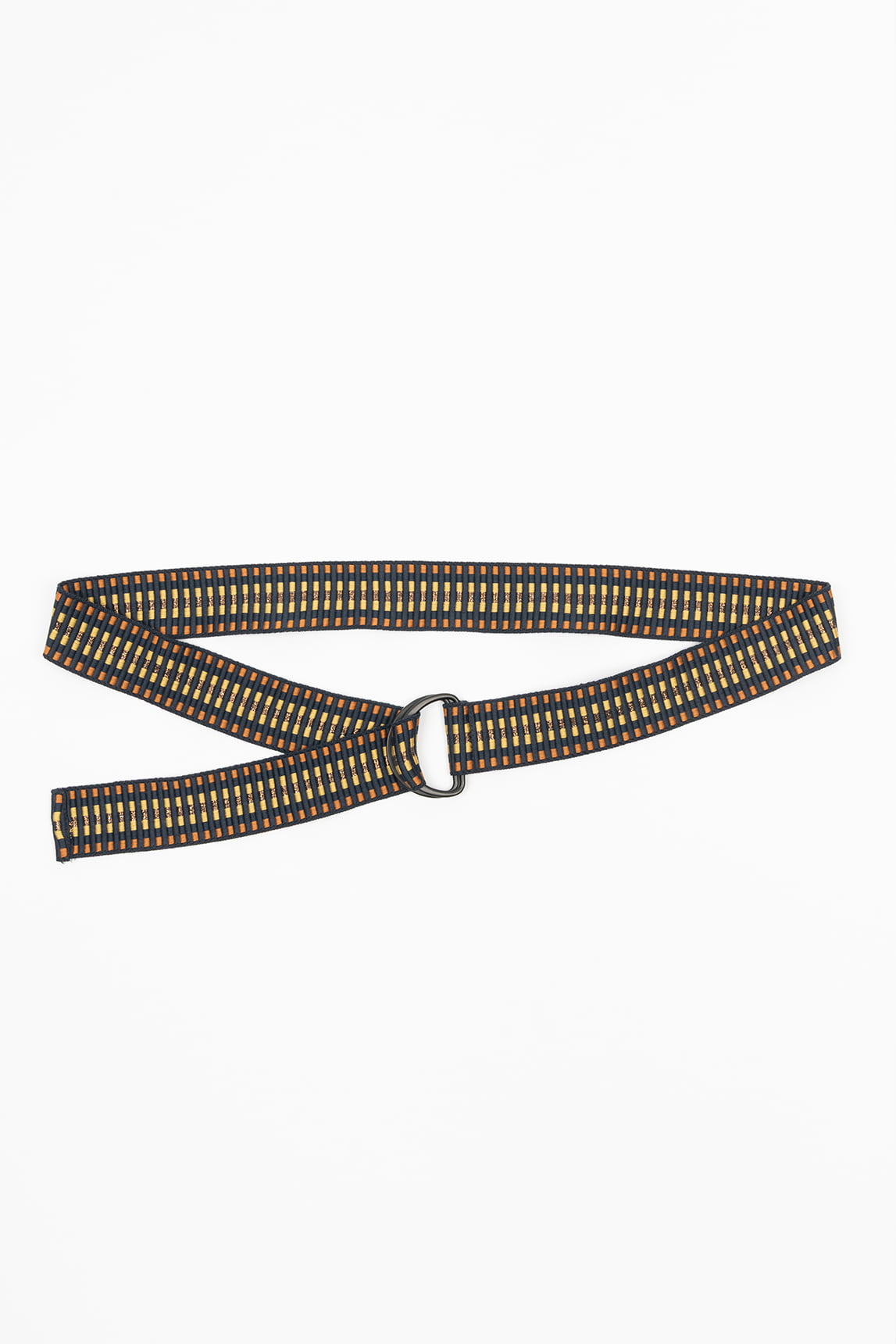- Cinturón con diseño de rayas verticales en tonos mostaza, naranja y beige.