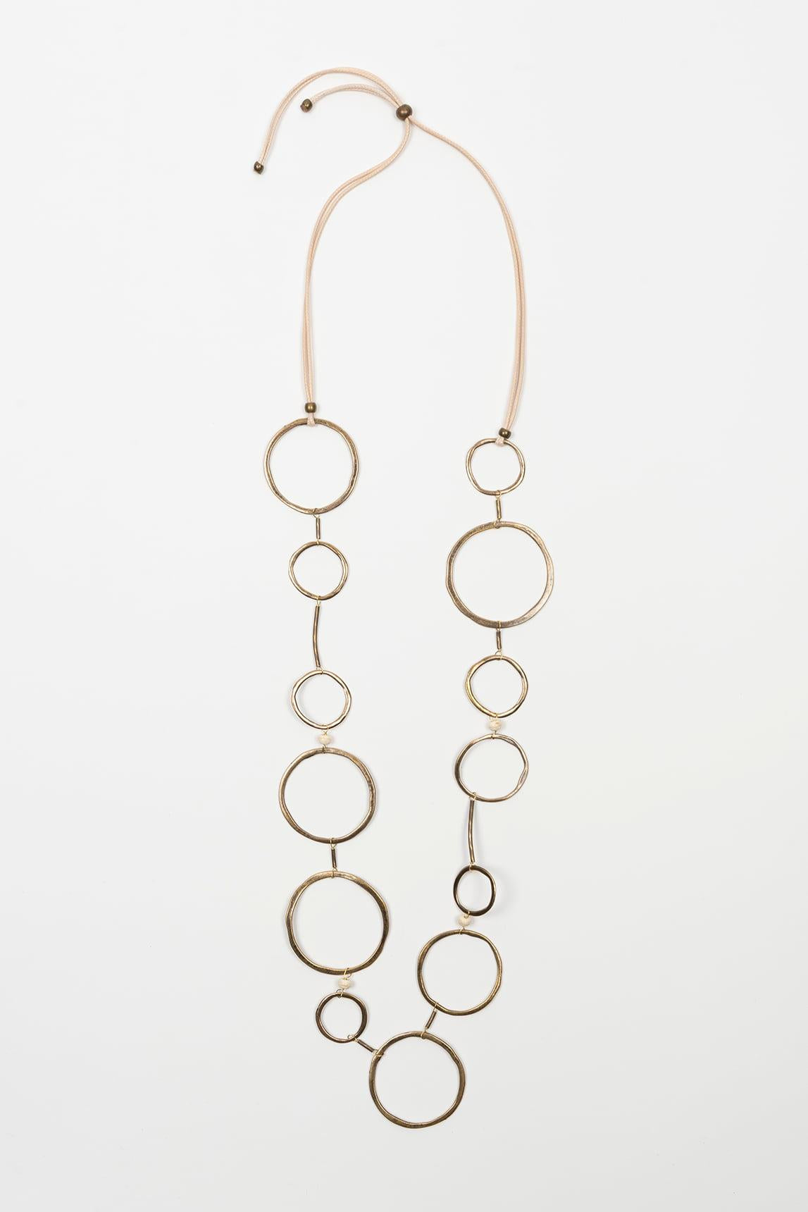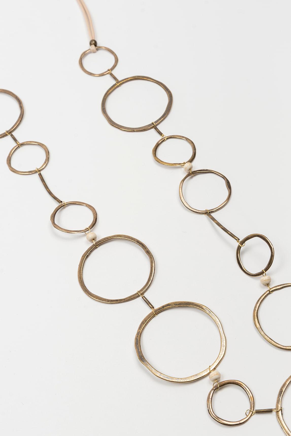 El collar Ciranel destaca por su diseño largo y geométrico compuesto por una sucesión de aros metálicos de distintos tamaños que crean un ritmo visual dinámico y elegante. Su estructura ligera genera movimiento natural al caminar, aportando sofisticación sin rigidez.