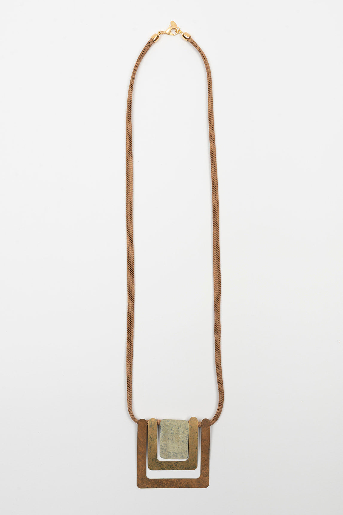 Collar largo de línea depurada con cadena tipo malla en tono bronce, rematado por un colgante geométrico de placas cuadradas superpuestas. La pieza central combina una base de doble marco con un cuadrado frontal en acabado más claro, creando un contraste sutil y un efecto de profundidad muy elegante. El cierre metálico queda integrado en la parte superior para mantener la silueta continua y dejar todo el protagonismo al colgante.