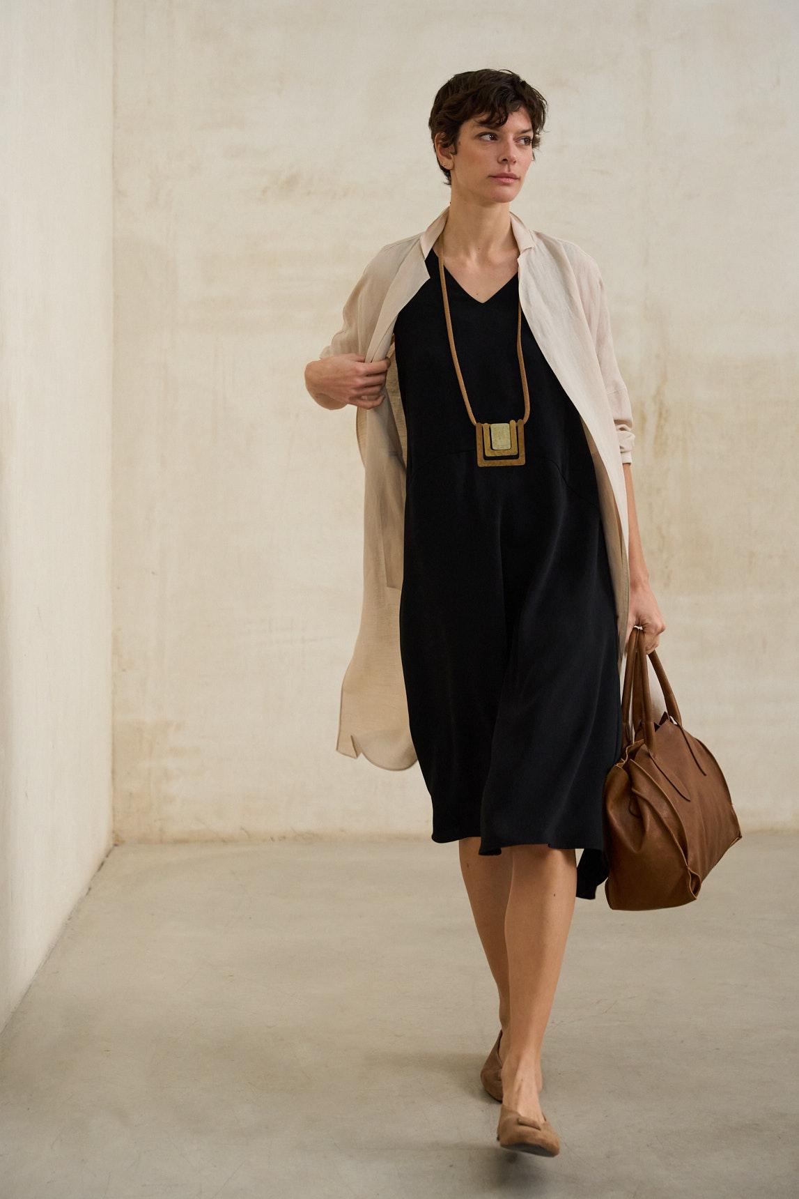 Su diseño es claramente arquitectónico: cae recto, estiliza el torso y aporta un punto contemporáneo sin necesidad de recargar el look. Funciona especialmente bien sobre prendas lisas —camisas, punto fino o vestidos minimal— porque el colgante estructura el conjunto y añade carácter con un brillo apagado, fácil de combinar tanto con neutros como con tonos tierra.